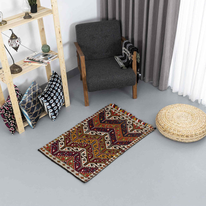 Discover the beauty of our Oriental Kilim Cicim , expertly crafted from handmade wool on wool , measuring 60 x 90 cm (2' x 3'). This stunning kilim features vibrant multicolor hues and ethnic geometric patterns , making it a perfect addition to your home decor.