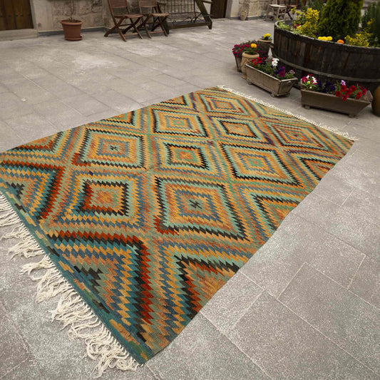 Oriental Kilim Fethiye Handmade Wool On Wool 176 x 265 Cm - 5' 10'' x 8' 9'' Green C015 ER12