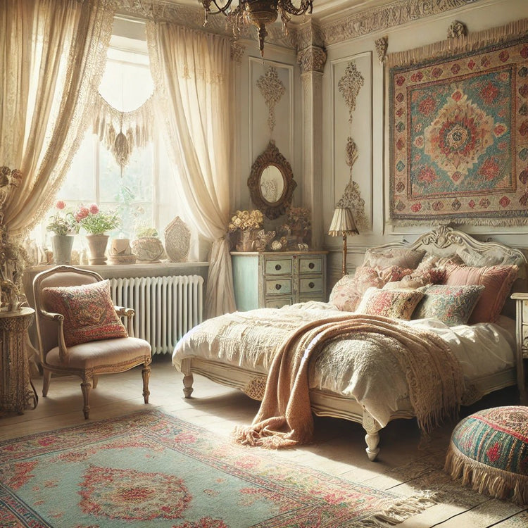Shabby Chic style is a feminine and soft interior design style that brings the charm and romance of the old world into the modern era. The furniture and decor elements used in this style are often vintage and distressed in appearance. Delicate embellishments, pastel tones, floral patterns, and natural textures are the defining features of Shabby Chic style. In this interior style, carpets also play an important role and add a nice touch to the space. So, what should you consider when choosing a carpet for Shabby Chic style?