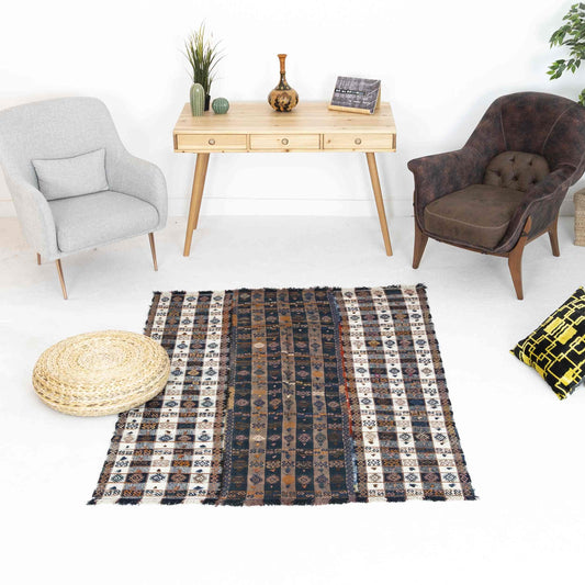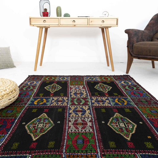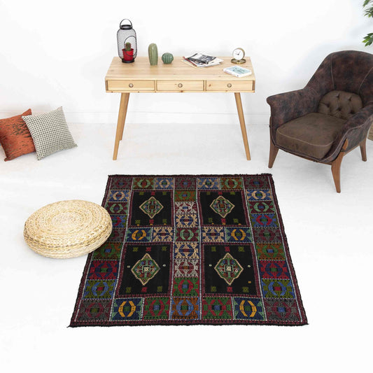 Oriental Kilim Cicim Handmade Wool On Wool 134 x 174 Cm - 4' 5'' x 5' 9'' Black C002 ER01