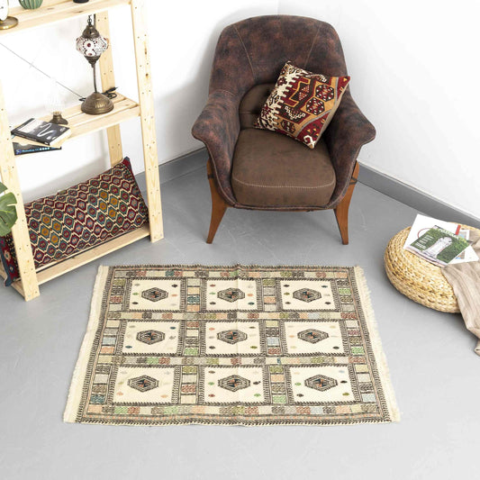 Oriental Kilim Cicim Handmade Wool On Wool 93 x 107 Cm - 3' 1'' x 3' 7'' Sand C007 ER01