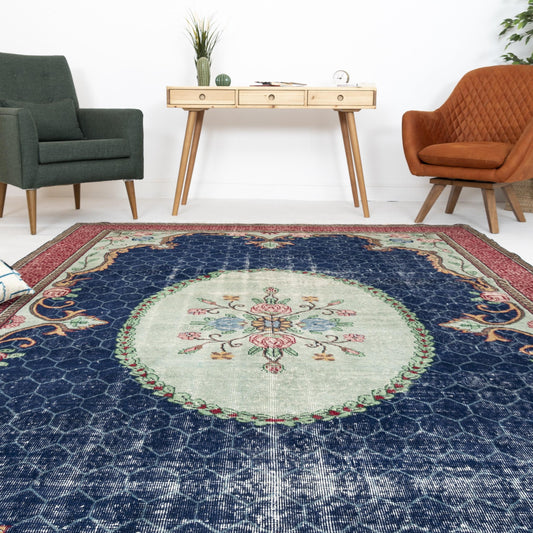 Oriental Rug Vintage Hand Knotted Wool On Cotton 221 x 330 Cm - 7' 4'' x 10' 10'' Navy Blue C012 ER23