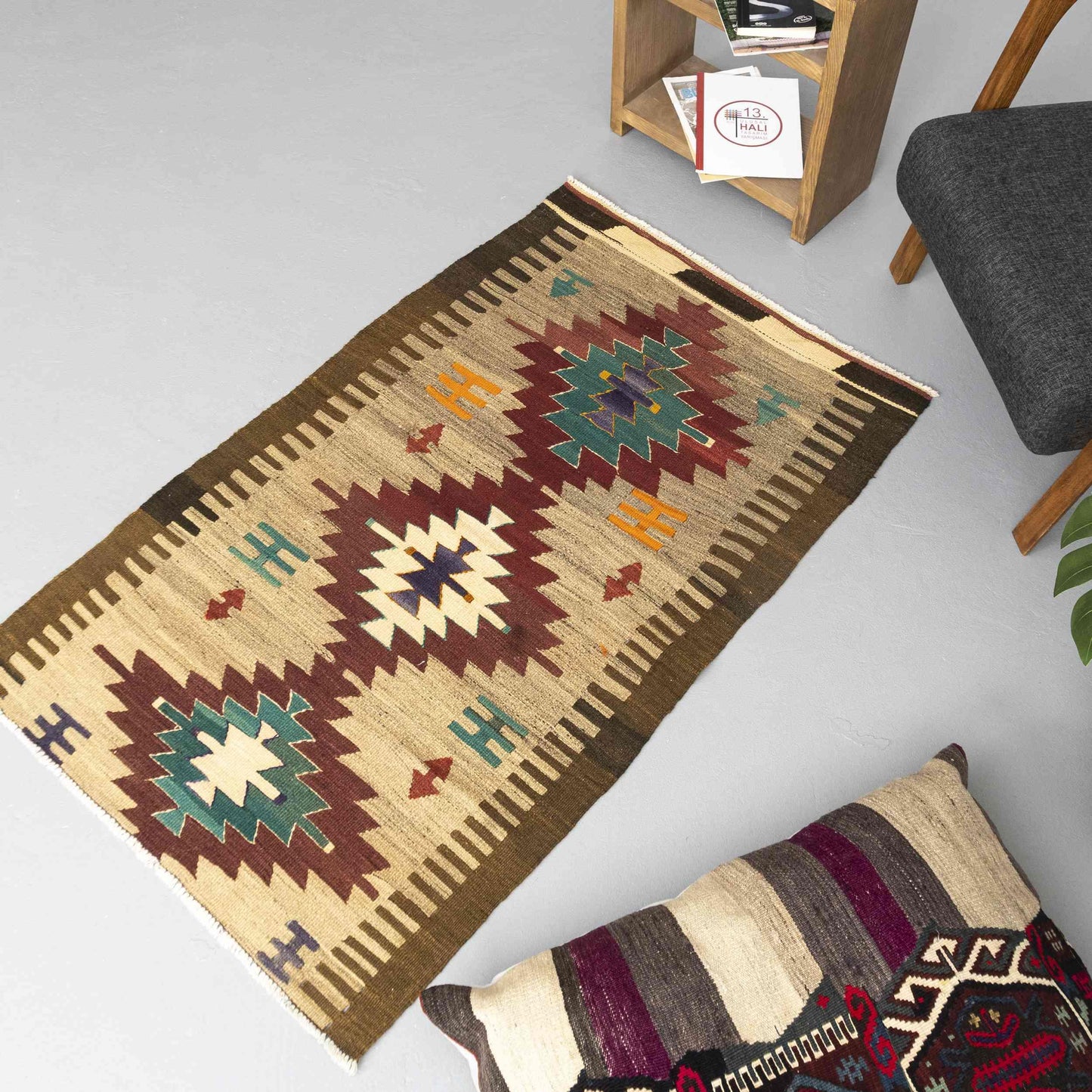 Kilim de Anatolia tejido a mano Lana sobre lana Auténtico Único 90 X 145 Cm - 3' X 4' 10'' m2: 1.305 Kilims de Anatolia son kilims y fundas tejidos a mano producidos en telares manuales, basados en la tradición de tejido que los turcos que emigraron de Central Asia trajo consigo a Anatolia desde su tierra natal. La razón por la que el kilim apareció por primera vez en Asia Central es que la principal fuente económica de los turcos, que tienen una cultura esteparia nómada, es la cría de animales. La materia prima del kilim es generalmente lana de oveja.