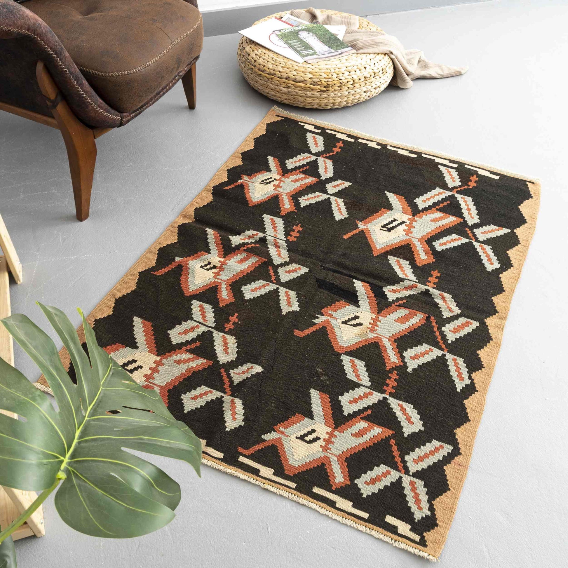 Kilim oriental de Anatolia, hecho a mano, de lana sobre lana, 95 x 131 cm, 3' 2'' x 4' 4'', negro C002 ER01
