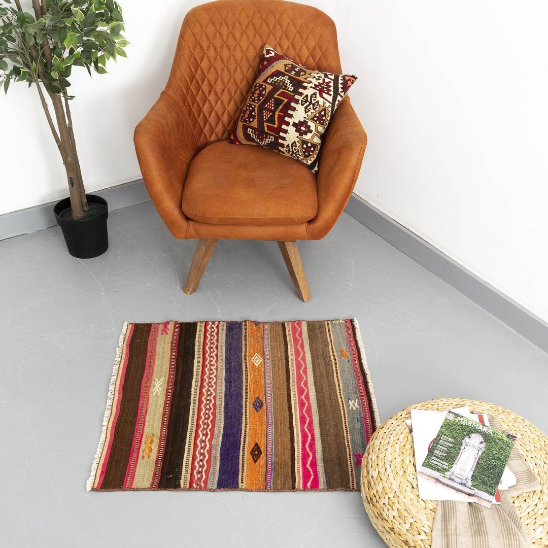 Adéntrate en un mundo de kilims de Anatolia , donde el arte hecho a mano se fusiona con el patrimonio cultural . Este exclusivo kilim de lana sobre lana , que mide 74 x 83 cm , presenta patrones multicolores que reflejan siglos de historias tejidas en cada hilo.