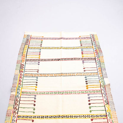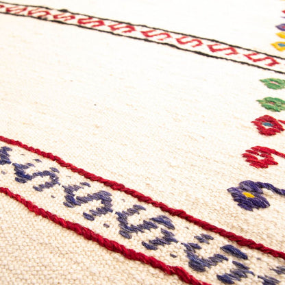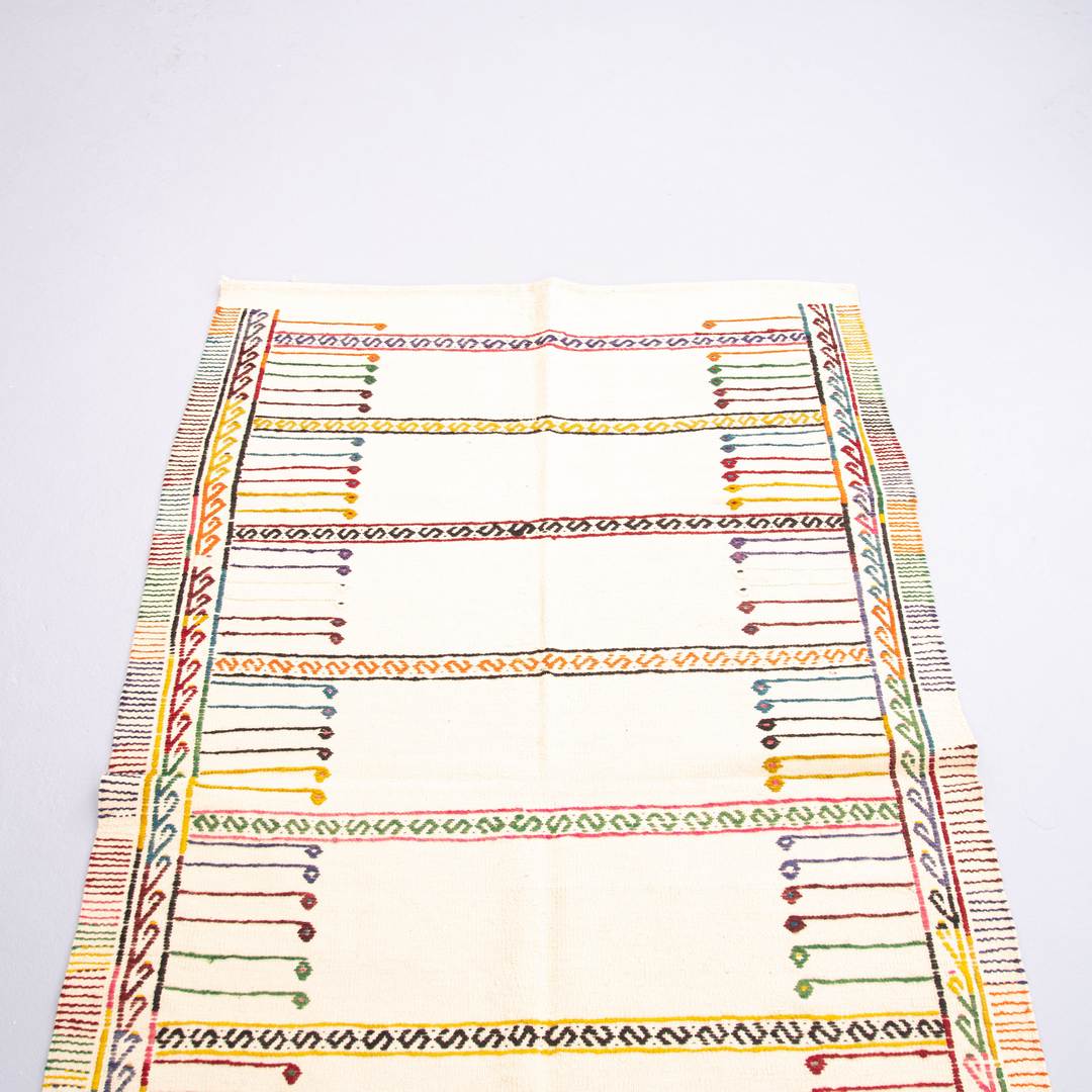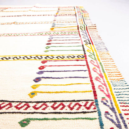 Descubra el Kilim oriental Cicim , un impresionante kilim de lana sobre lana hecho a mano de 100 x 167 cm (3' 4" x 5' 6") . Esta exquisita pieza presenta un cautivador diseño en tonos arena y multicolor que aporta calidez y personalidad a cualquier habitación.