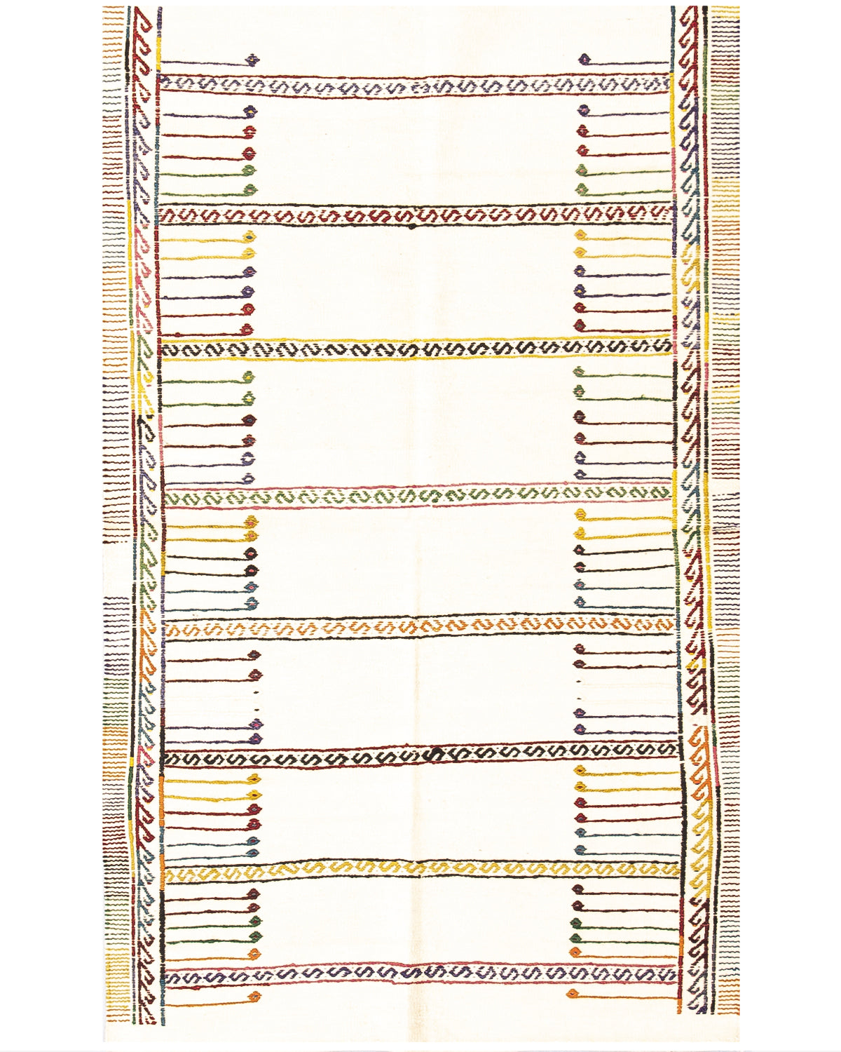 Los kilims cicim son una parte esencial del arte textil turco , y tienen su origen en las culturas nómadas de Asia Central . El término "cicim" resalta los intrincados detalles de costura que definen a estos kilims. Esta pieza, tejida expertamente con hilos de lana, algodón o seda, está teñida con métodos naturales y exhibe colores vibrantes y motivos ricos inspirados en la naturaleza y la vida cotidiana.