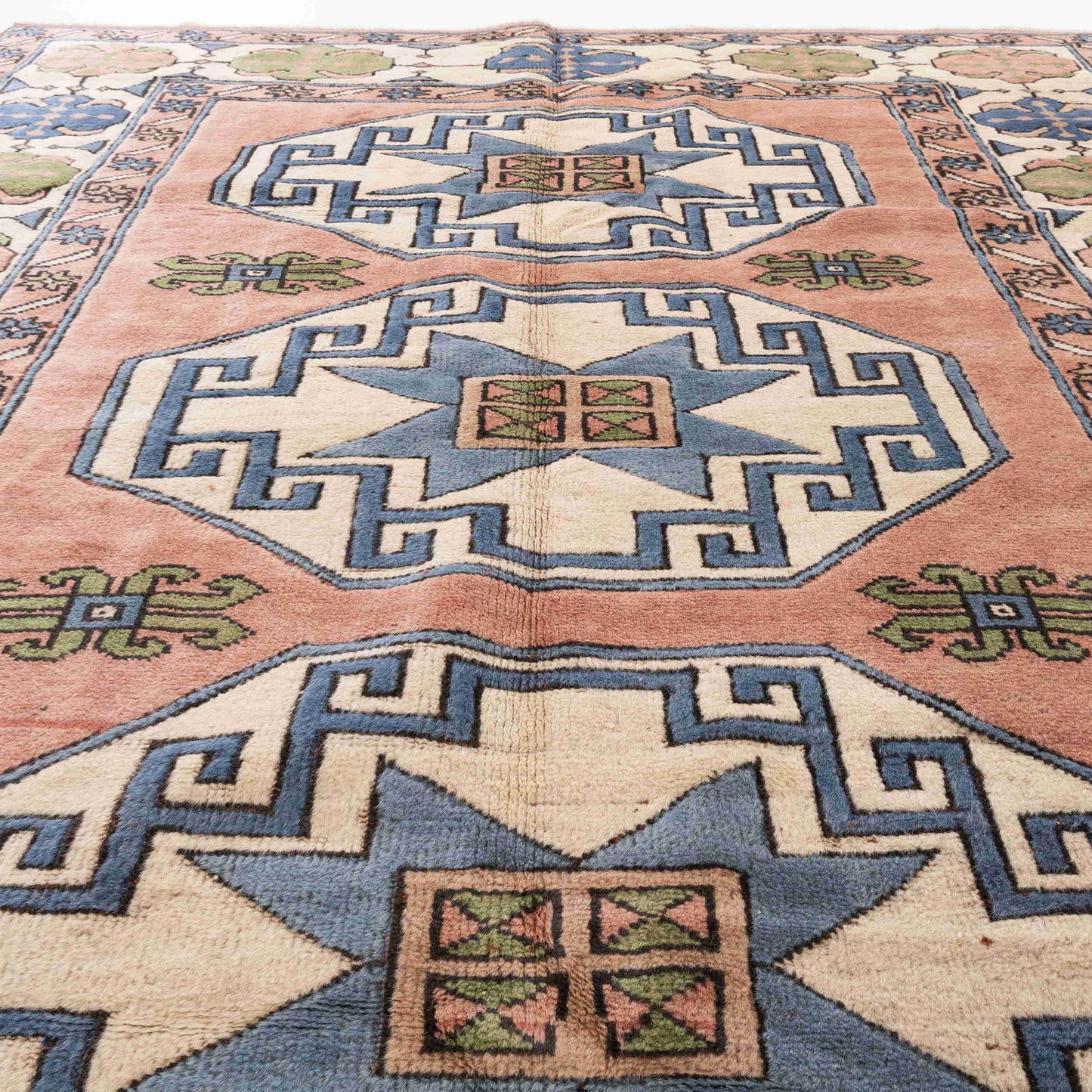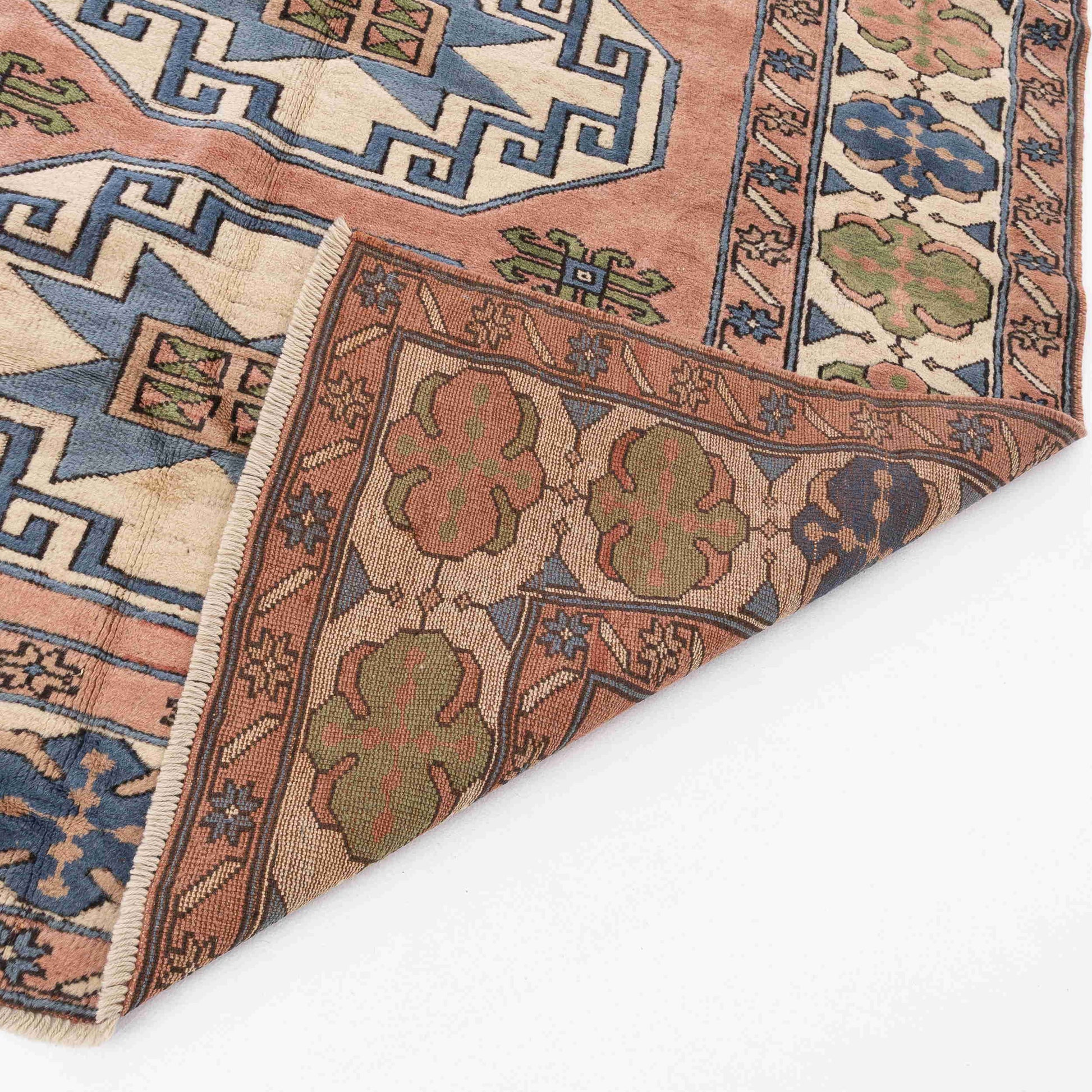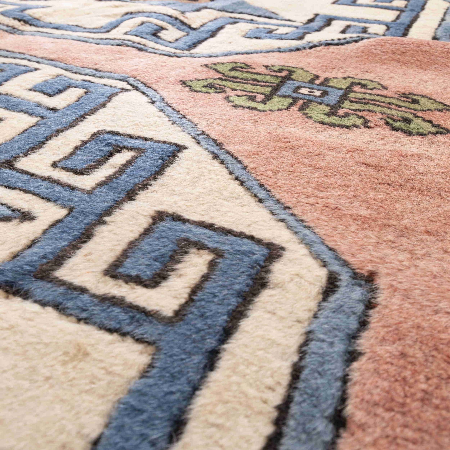 Estas alfombras están repletas de composiciones de medallones que incorporan motivos estilizados de plantas , pájaros y dragones junto con diseños geométricos como ganchos , flechas y cuernos de carnero . La paleta de colores vibrantes incluye rojos , azules profundos , verdes y tonos terrosos cálidos , con tonos naturales extraídos directamente de la lana de oveja .