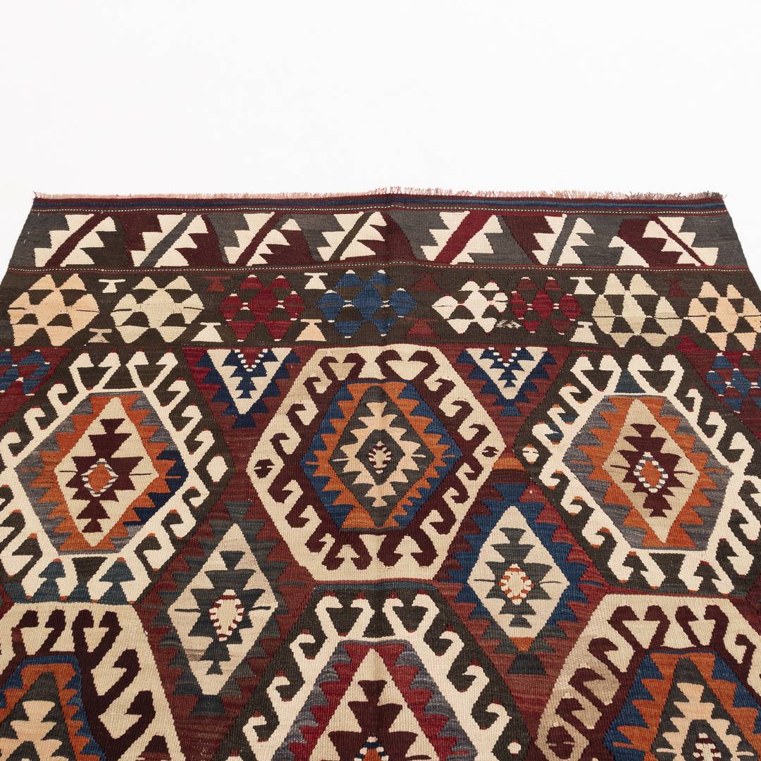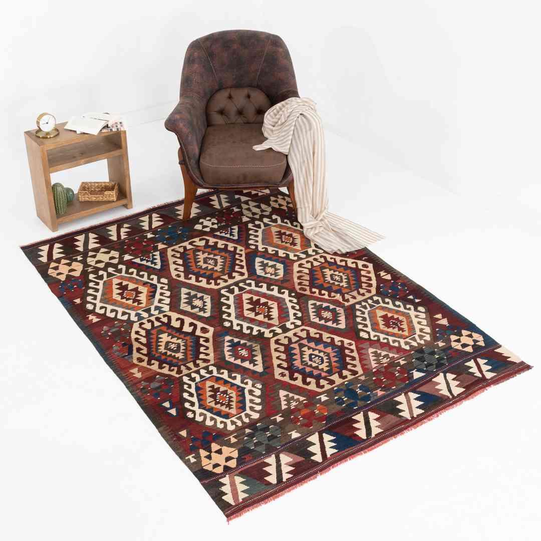 Experience the allure of the Oriental Kilim, an Anatolian Handmade Wool rug measuring 158 x 221 cm (5' 3'' x 7' 4'') in Burgundy and Multicolor. Each kilim tells a story woven from 3500 years of rich history, transforming your space into a haven of culture and artistry.