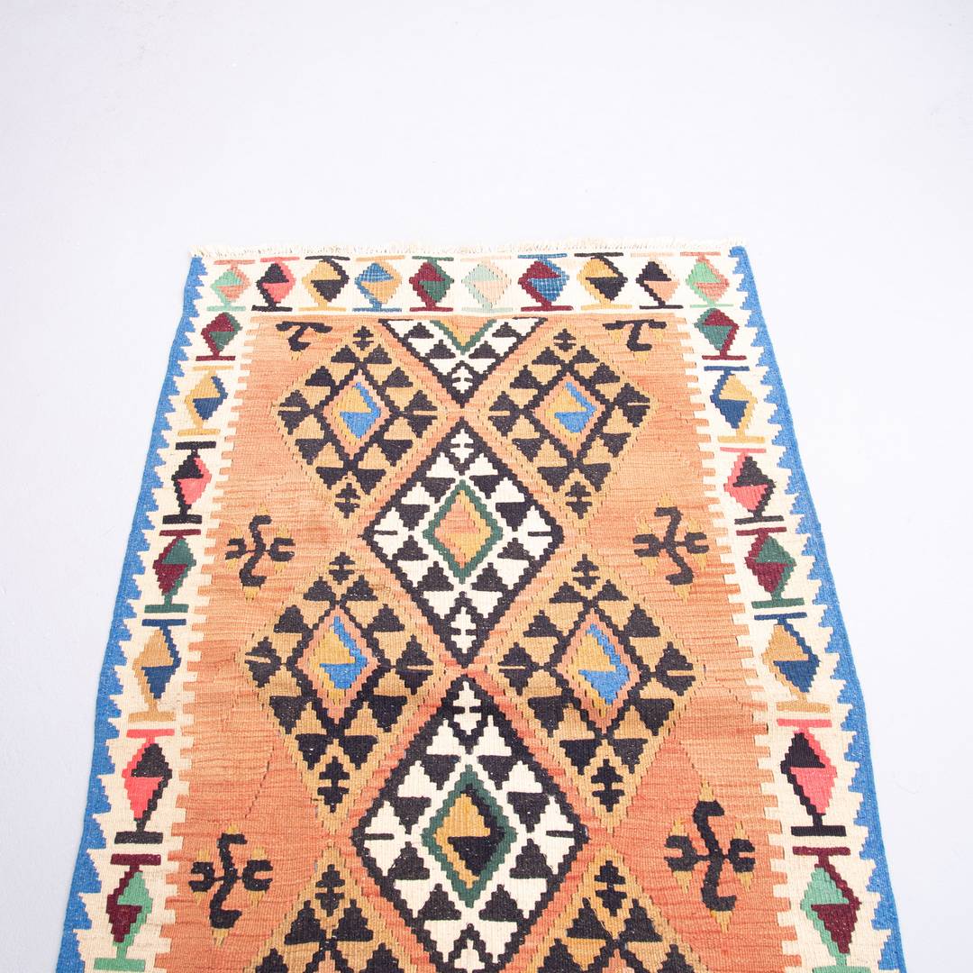 Discover the beauty of our Oriental Kilim, measuring 87 x 168 cm (2' 11'' x 5' 7''), handcrafted with durable wool in vibrant orange and multicolor hues. This exquisite piece is not just a rug; it's a statement of tradition and artistry!