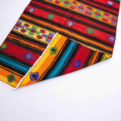 Step into a world where each handmade kilim whispers tales from centuries past. This exquisite piece, crafted from wool on wool, carries a 3500-year-old story that awaits your discovery.