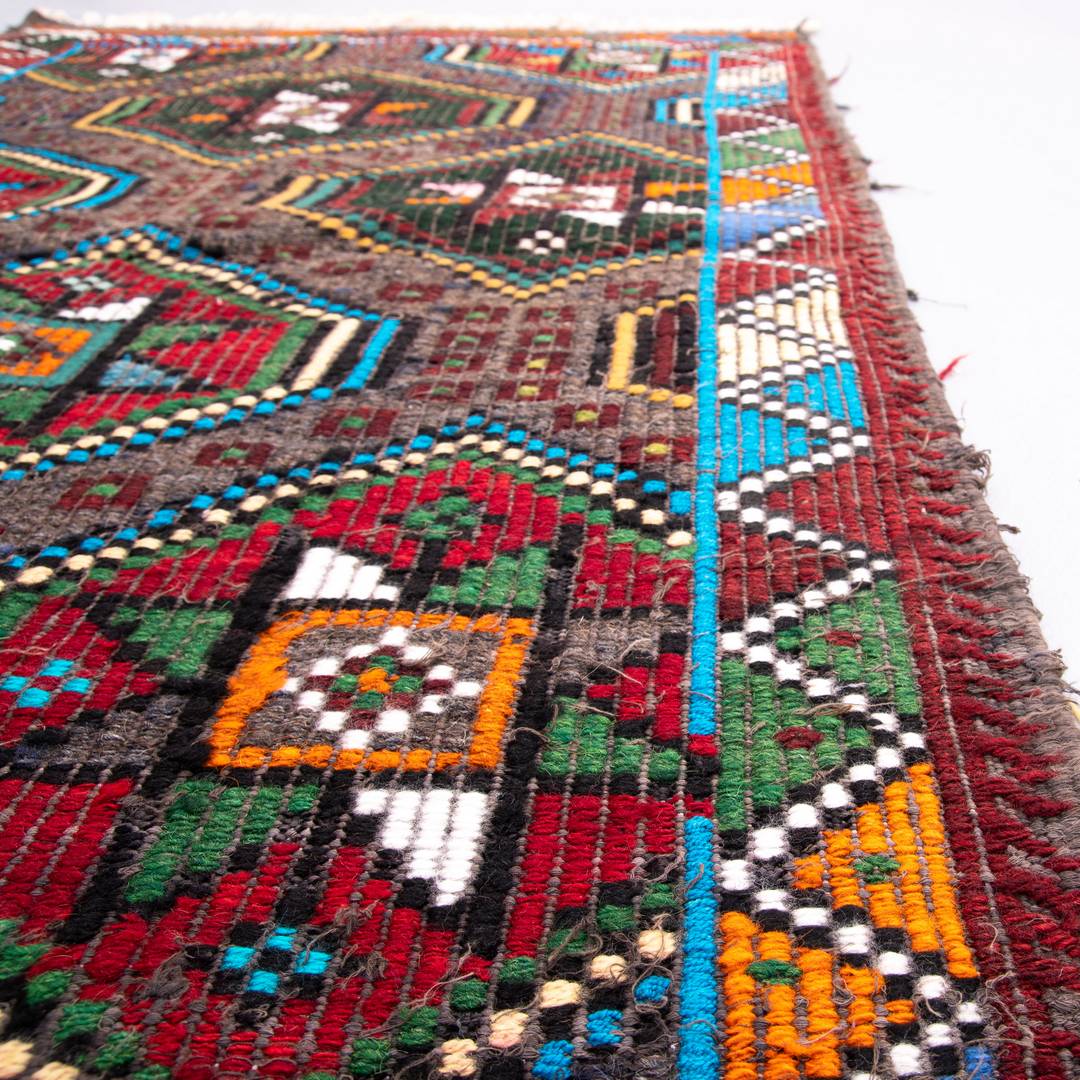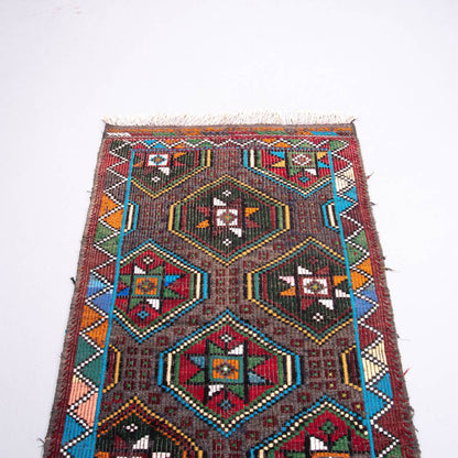 Embrace the beauty of our Oriental Kilim Cicim measuring 91 x 160 cm (3' x 5' 3") in a stunning multicolor design. Crafted from handmade wool on wool, this exquisite cicim kilim showcases intricate stitching details that add depth and character to any space.
