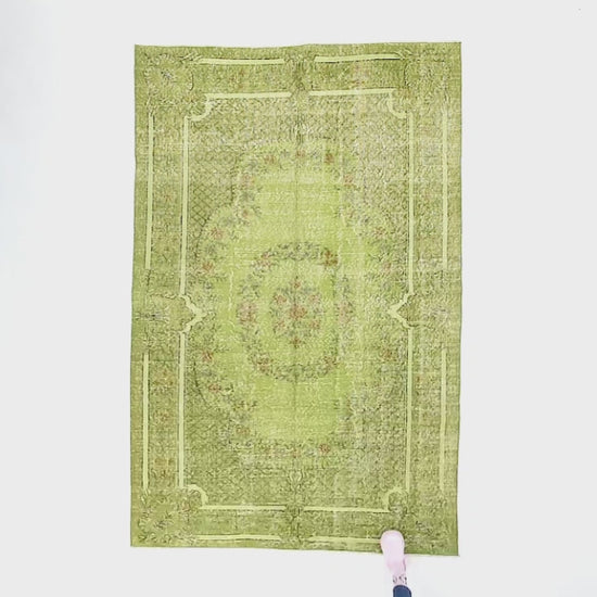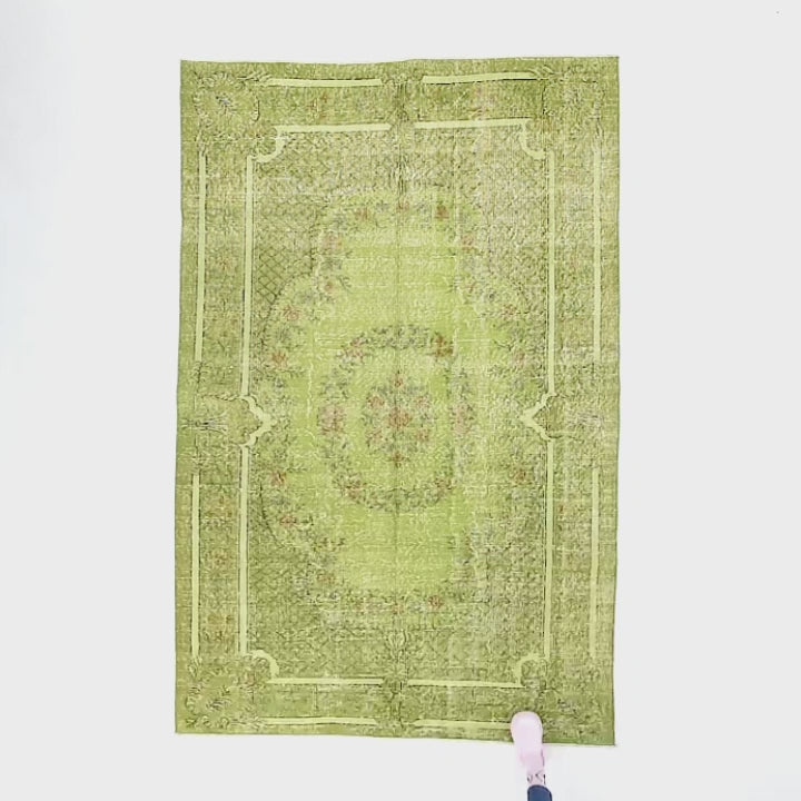 Introducing our Oriental Rug – a Vintage Hand Knotted Wool masterpiece measuring 160 x 245 cm (5' 3'' x 8' 1'') in a stunning green color! Crafted by skilled nomadic weavers in Turkey, this Turkish rug showcases highly decorative and unique designs inspired by rare antique tribal rugs from the heart of Anatolia.