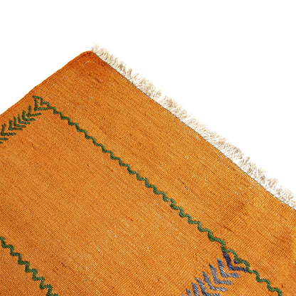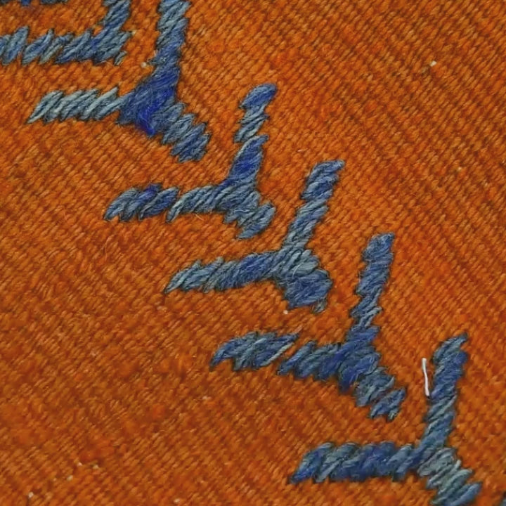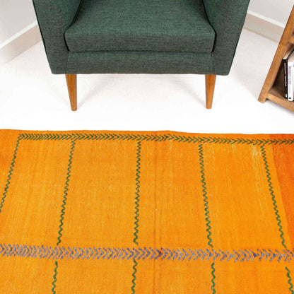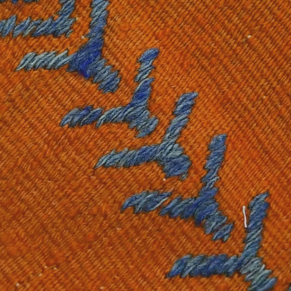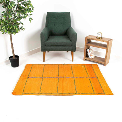 Oriental Kilim Anatolian Handmade Wool On Wool (105 x 148 cm - 3' 6'' x 4' 11''), featuring vibrant orange geometric patterns, invites you to step into a world steeped in history and culture. Each handmade kilim is a unique piece of art that tells the story of centuries past, woven with love and tradition.