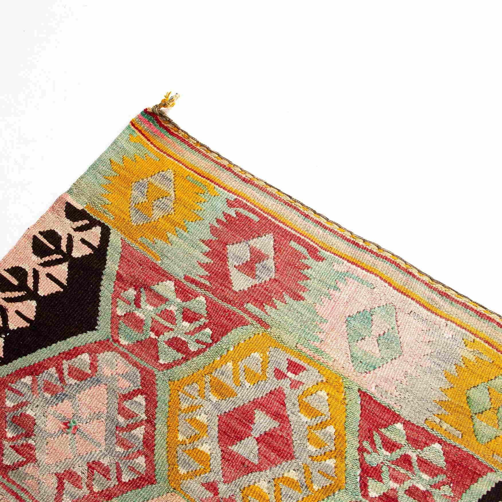 Discover the magic of this handmade Anatolian kilim, crafted from 100% wool and featuring vibrant geometric patterns in a multicolor palette. Perfect for bohemian, ethnic, or eclectic interiors, this kilim not only adds a splash of character to any space but also tells the story of 3,500 years of weaving tradition.