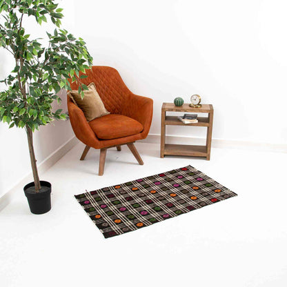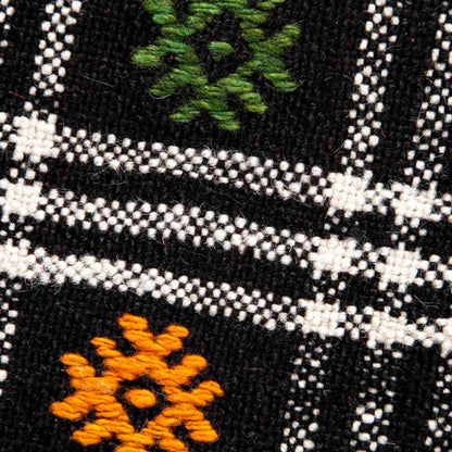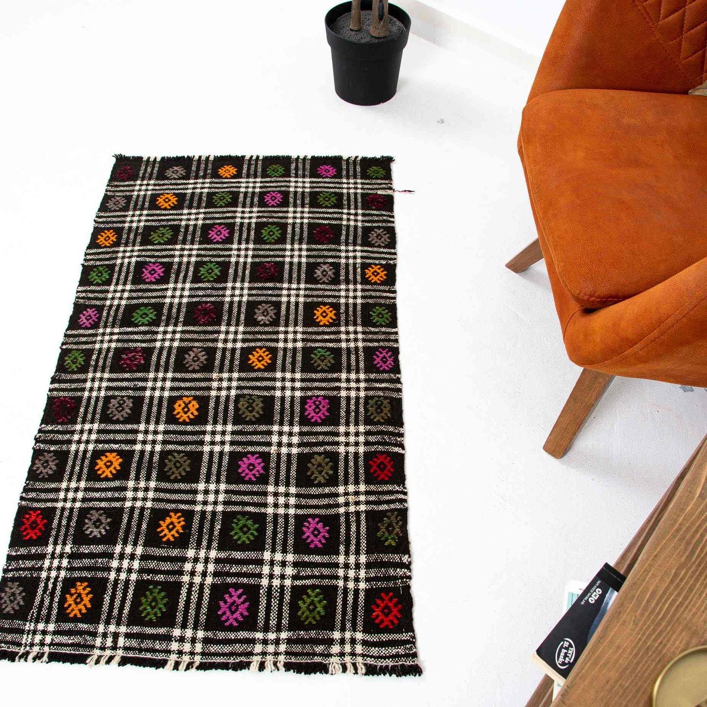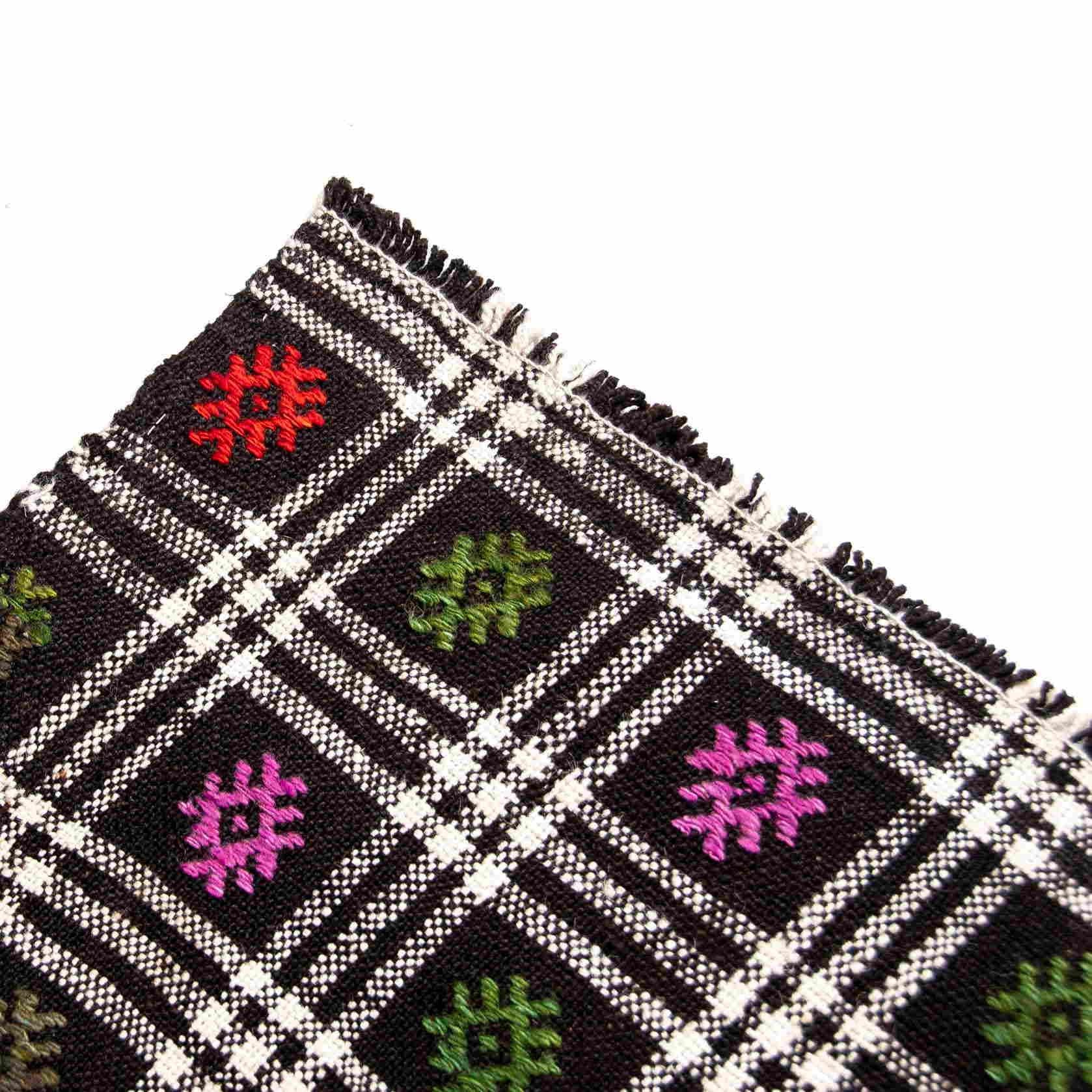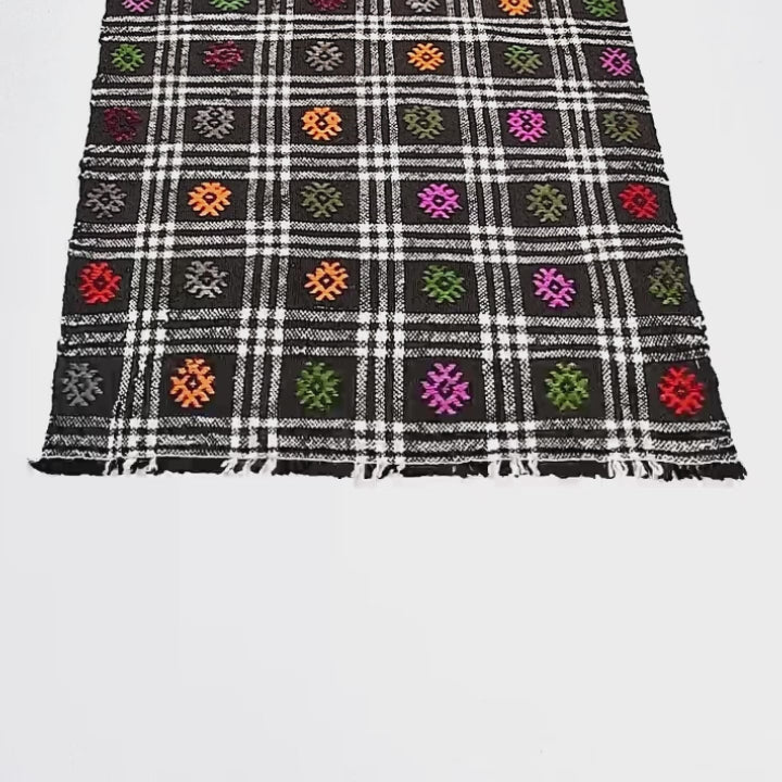 Elevate your space with this stunning Oriental Kilim Cicim, featuring ethnic geometric patterns in a beautiful blend of black and multicolor. Handcrafted from wool on wool, this exquisite piece not only adds warmth but also serves as a conversation starter.