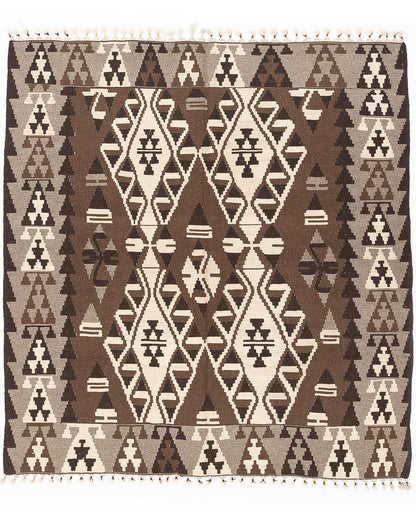 Transform your space with this exquisite Oriental Kilim! Measuring 200 x 215 cm (6' 7'' x 7' 1''), this handmade kilim is crafted from durable wool on wool, featuring stunning geometric, botanical, and animal motifs in a rich brown hue.