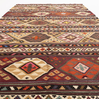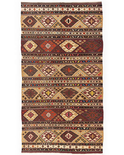This handmade Anatolian kilim, measuring 164 x 310 cm, is woven from high-quality wool and features stunning geometric ethnic patterns in stone and multicolor hues. Perfect for adding warmth and cultural depth to bohemian, eclectic, or modern interiors, its bold design makes it an excellent fit for living rooms, dining areas, or bedrooms.