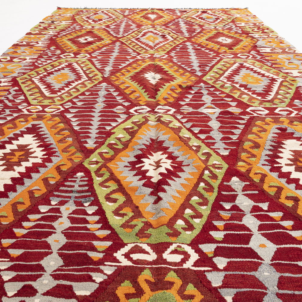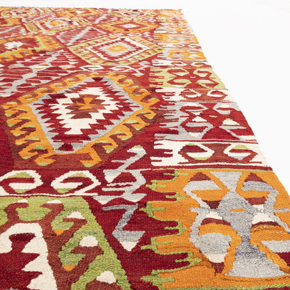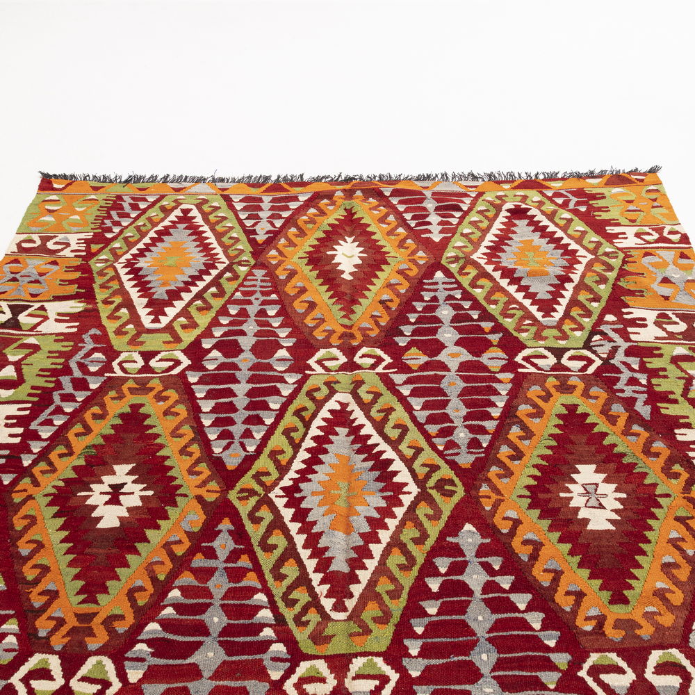 Embrace the vibrant colors of this orange and multicolor Anatolian kilim, featuring intricate ethnic geometric patterns that reflect a 3500-year-old story. Each handmade kilim is a unique masterpiece crafted from wool on wool, making it not only a stunning addition to your decor but also a testament to the rich cultural heritage of Anatolia.