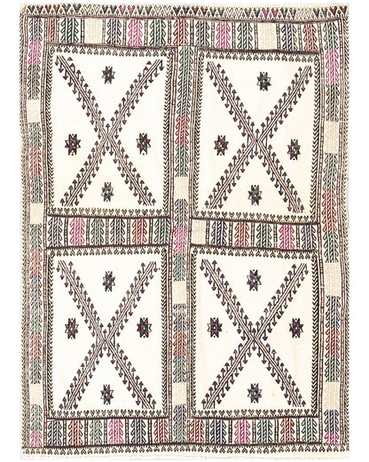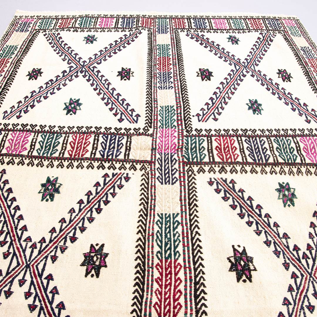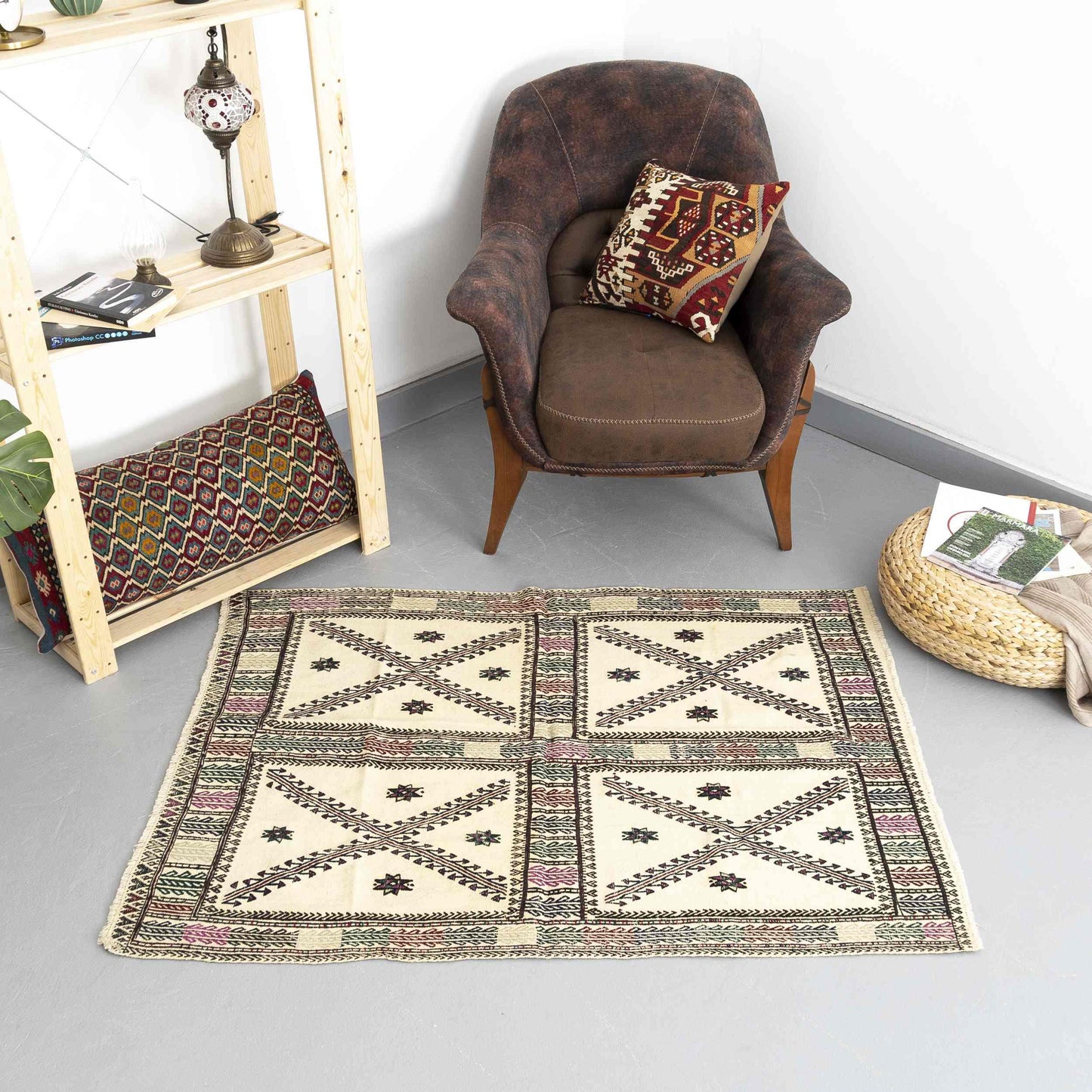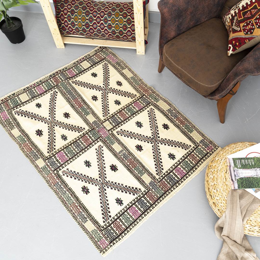 Looking to add a unique touch to your space? This 104 x 138 cm (3' 5'' x 4' 7'') Cicim Kilim in sand and multicolor is the perfect choice for a blend of tradition and style! Made from wool on wool, this stunning piece embodies the rich cultural history of Turkish textile art, particularly from the Eastern and Southeastern regions of Turkey.
