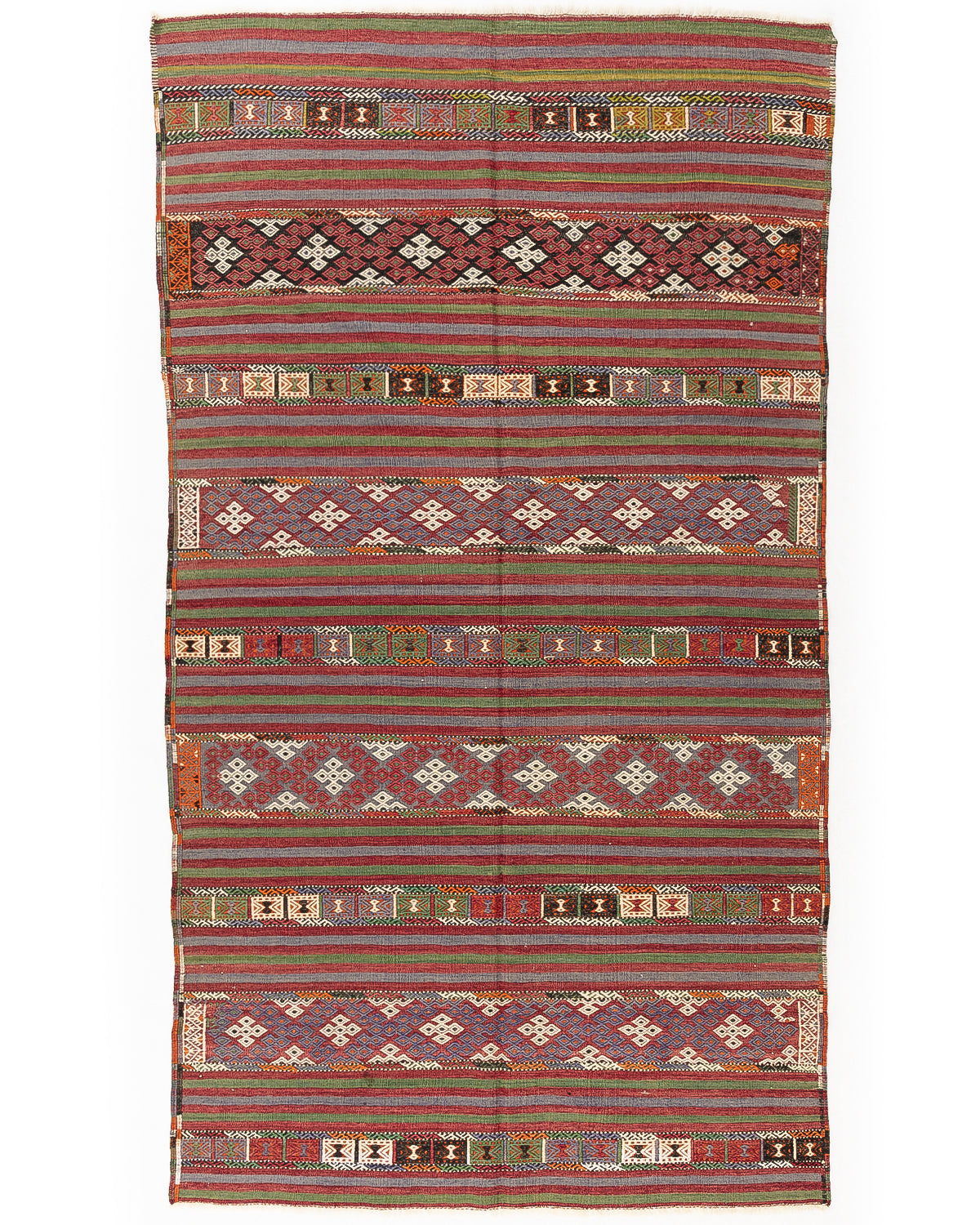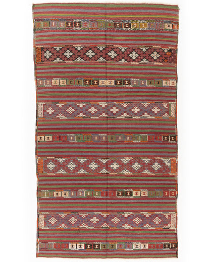 Cicim kilims are a significant element of Turkish textile art, traditionally crafted in the Eastern and Southeastern regions of Turkey. The term "cicim" highlights the intricate stitching details that adorn these kilims, connecting them to the nomadic cultures of Central Asia. Each piece is woven with wool, cotton, or silk yarns, resulting in vibrant patterns inspired by nature and daily life.