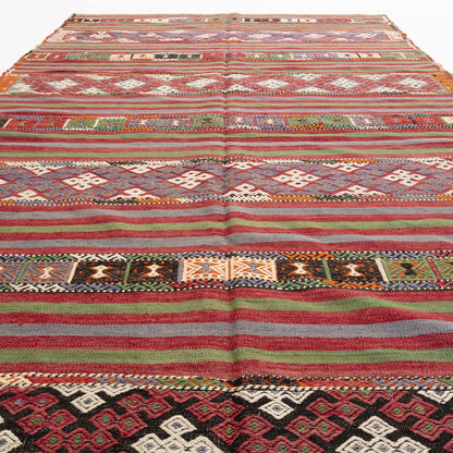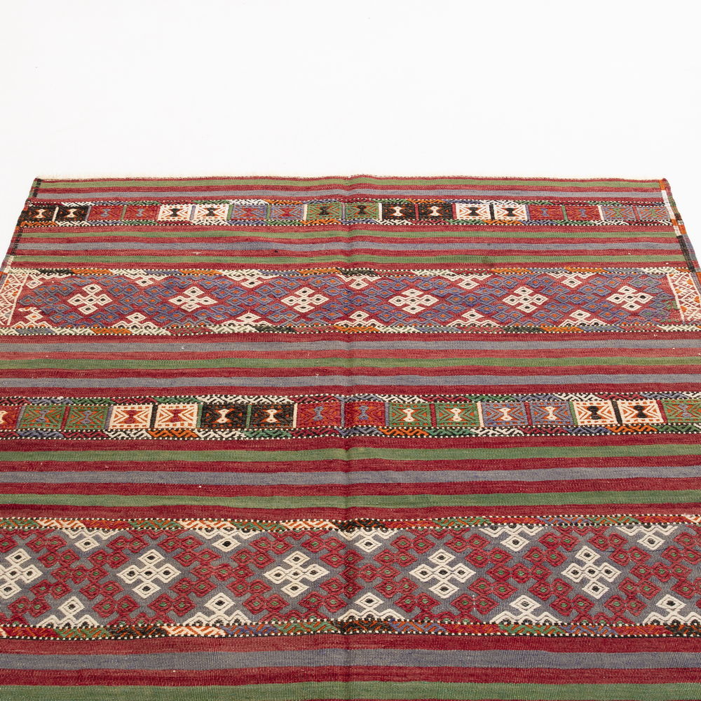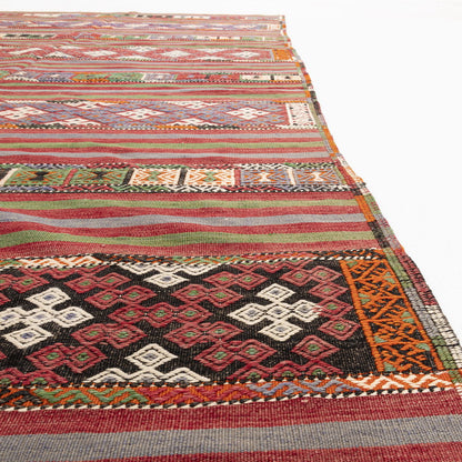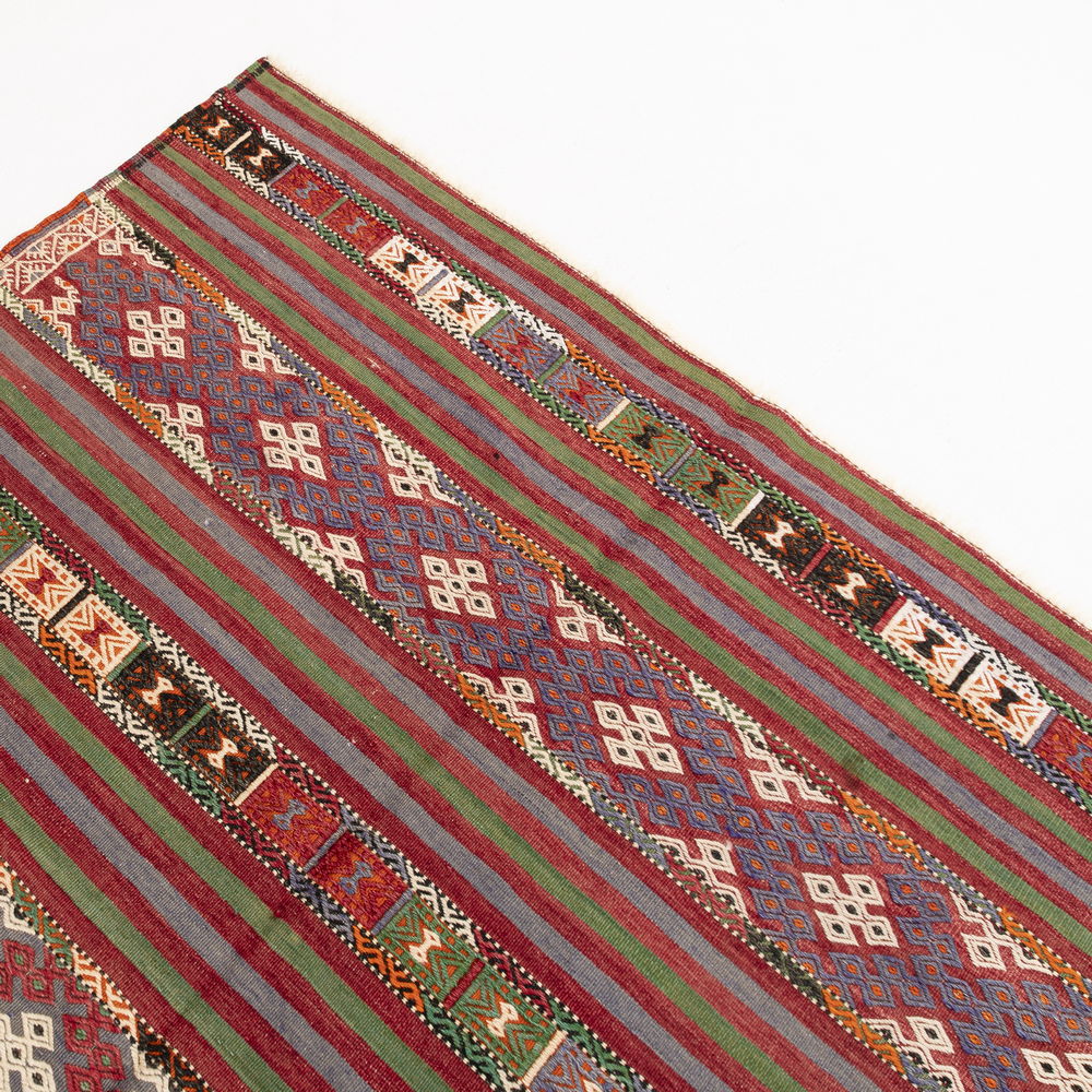 Elevate your space with this Oriental Kilim Cicim handcrafted masterpiece, measuring 174 x 318 cm (5' 9'' x 10' 6''). Made from wool on wool, it features stunning burgundy and multicolor designs that reflect the rich heritage of Turkish textile art.