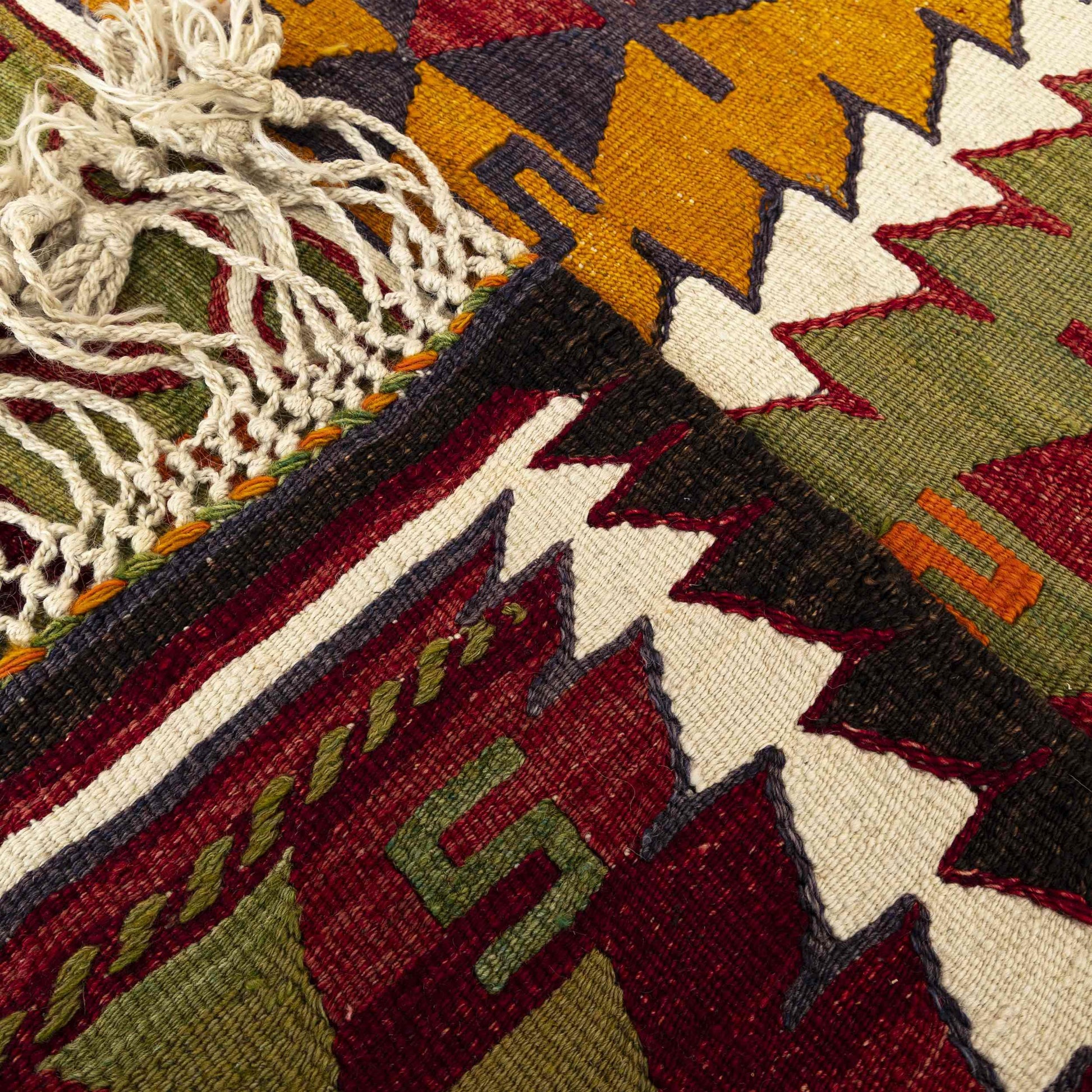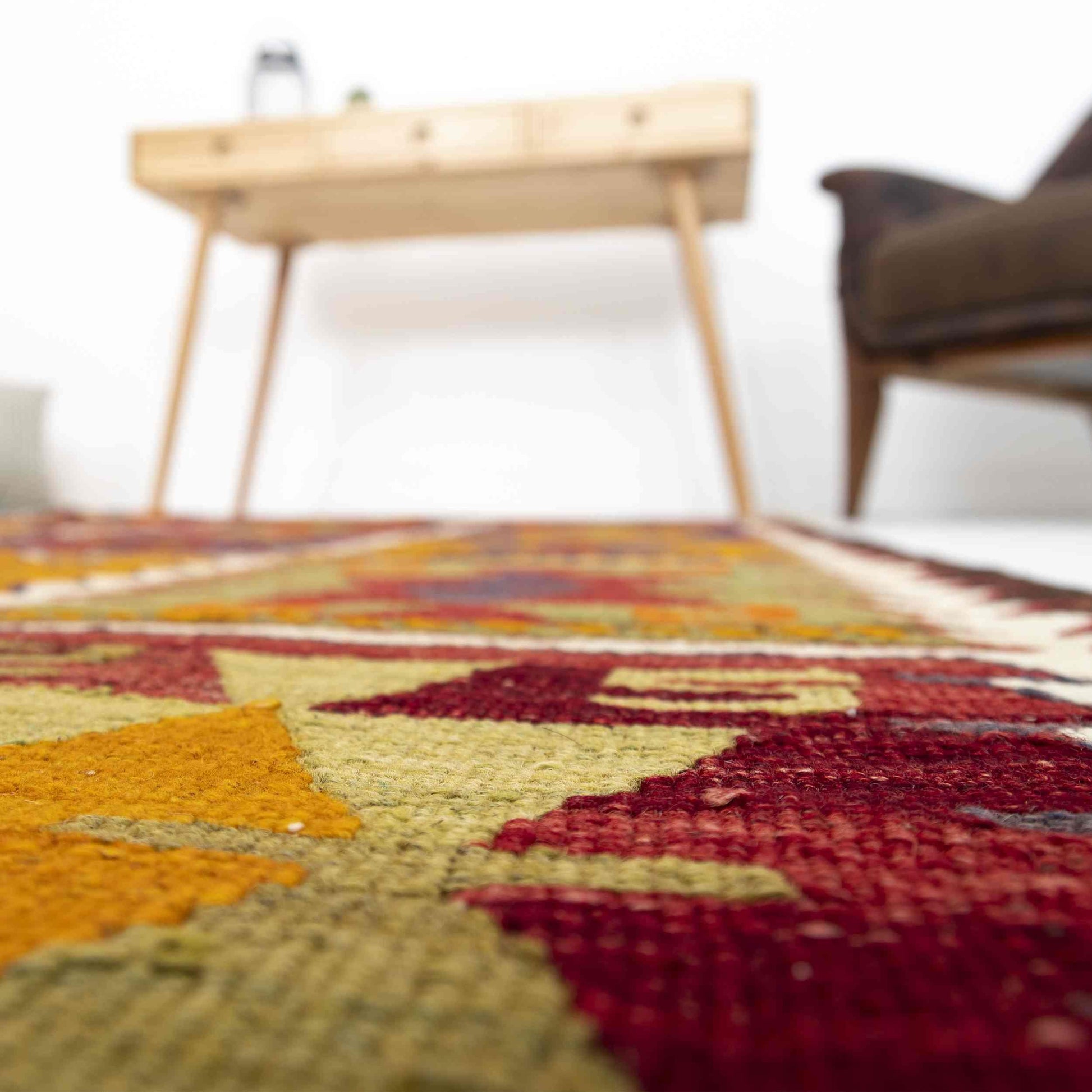 Transform your space with this stunning Anatolian kilim, a unique piece of handcrafted art steeped in 3500 years of history. Each wool-on-wool kilim is a celebration of cultural heritage, intricately woven by skilled artisans who breathe life into every thread.