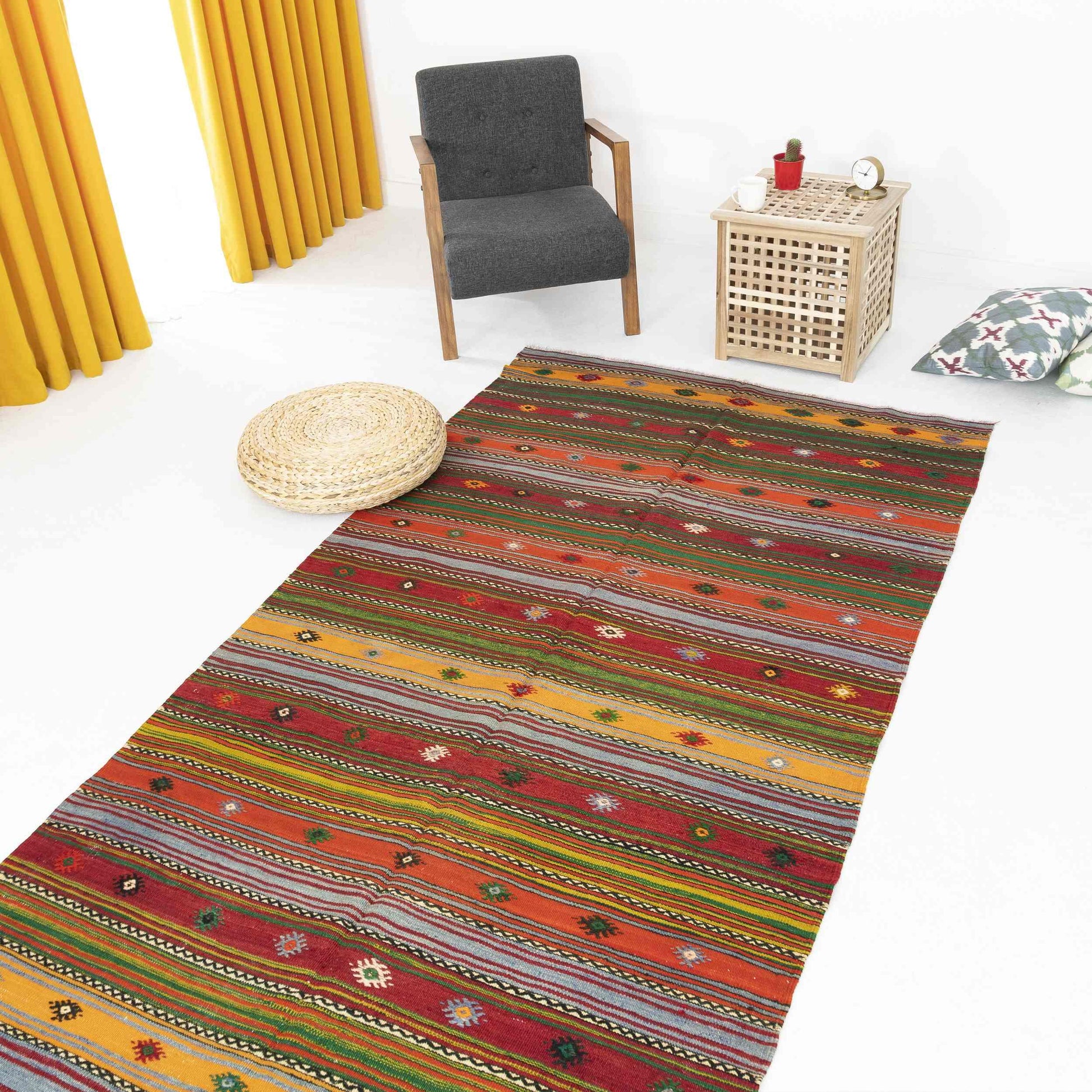 Step into a world of art and history with this Anatolian handmade kilim, featuring a stunning multicolor ethnic geometric pattern. Crafted from durable wool on wool, this 150 x 284 cm (5' x 9' 4") piece embodies the rich cultural heritage of Anatolia.