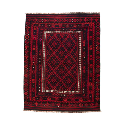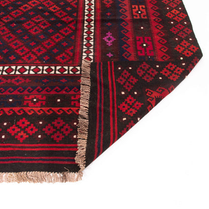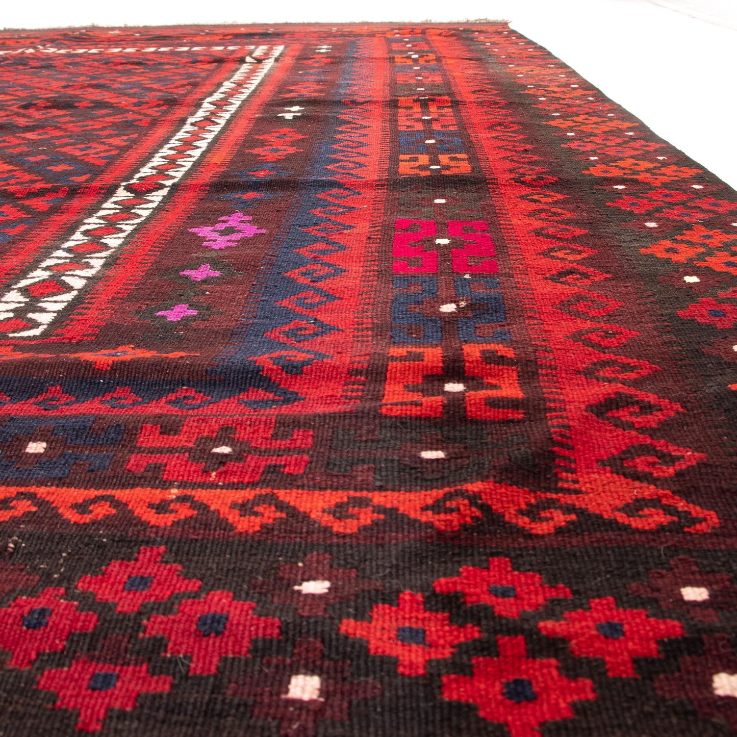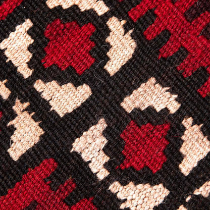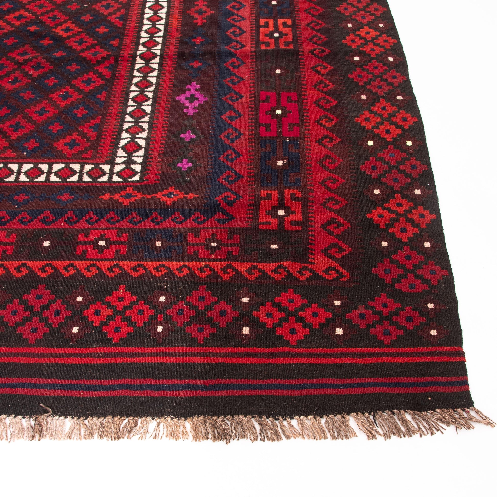 Step into a world of art with this stunning Anatolian kilim, expertly woven from natural wool and featuring an eye-catching red and black ethnic geometric pattern. Each kilim tells a 3500-year-old story, connecting you to the rich cultural heritage of Anatolia.