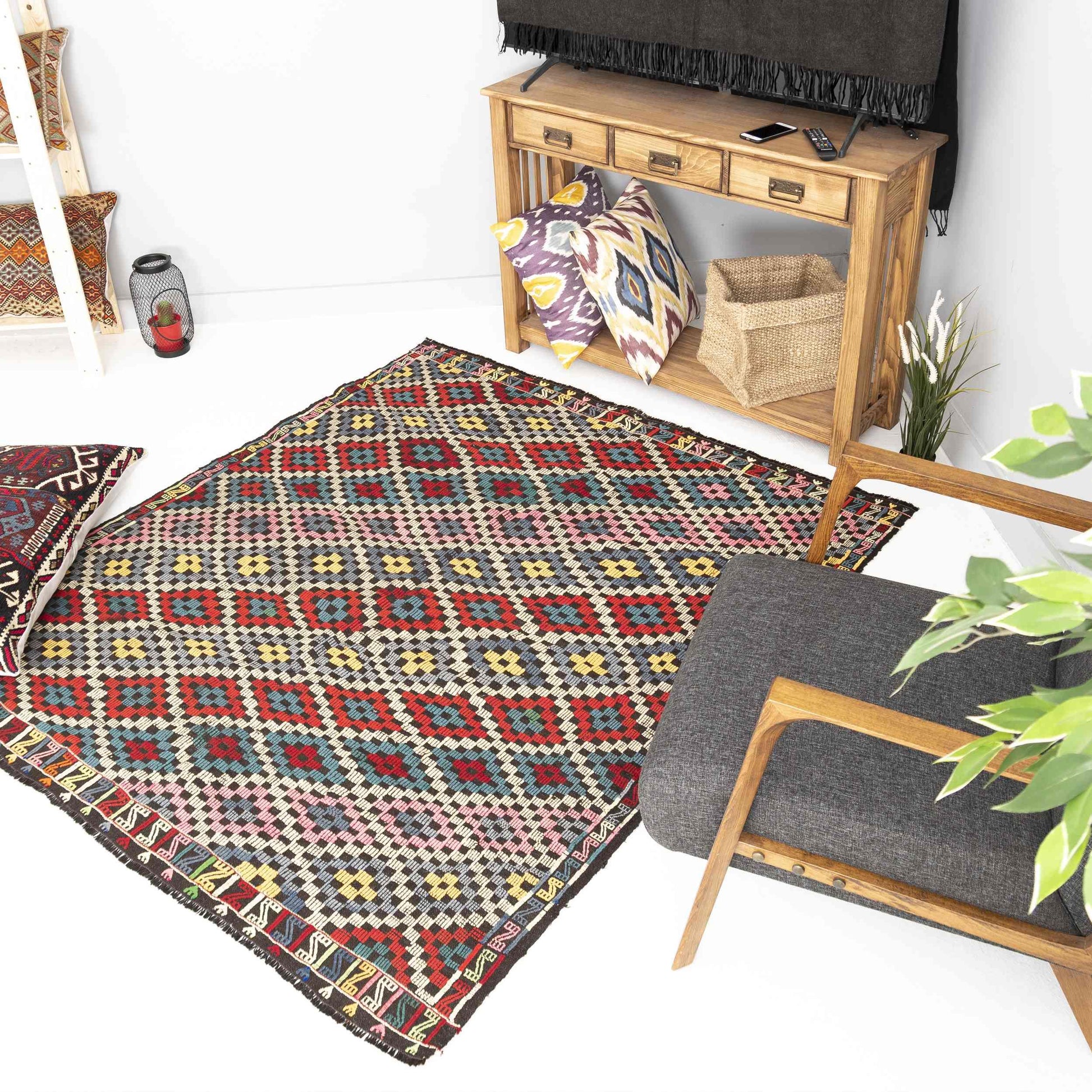 Discover the beauty of Cicim kilims, an essential element of Turkish textile art! This stunning handmade piece, measuring 162 x 183 cm (5' 4'' x 6' 1''), is crafted from wool on wool and features vibrant multicolor hues with intricate ethnic geometric patterns. The term cicim refers to the decorative stitching details that add a unique charm to each kilim.