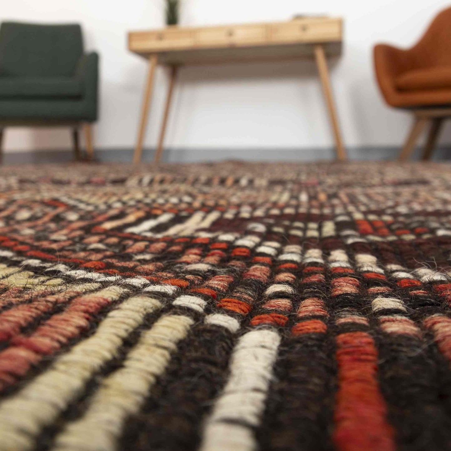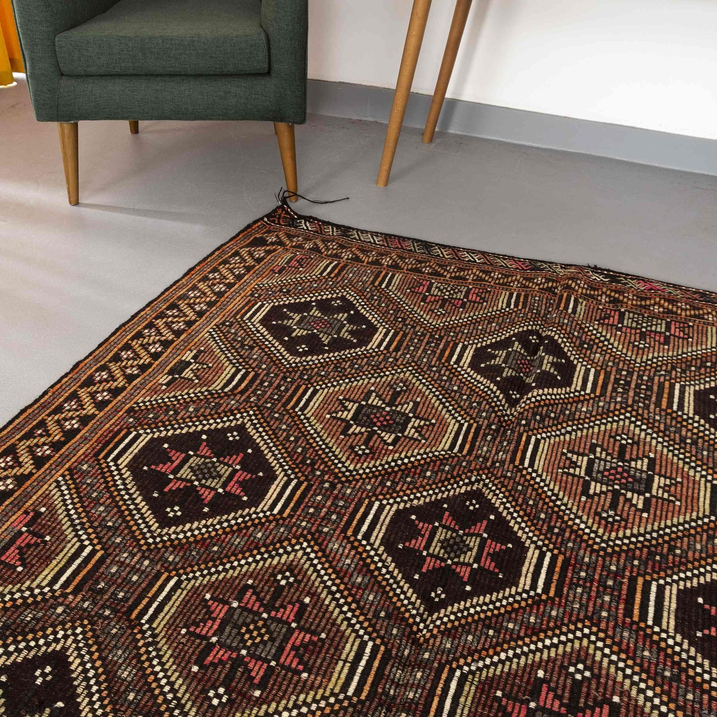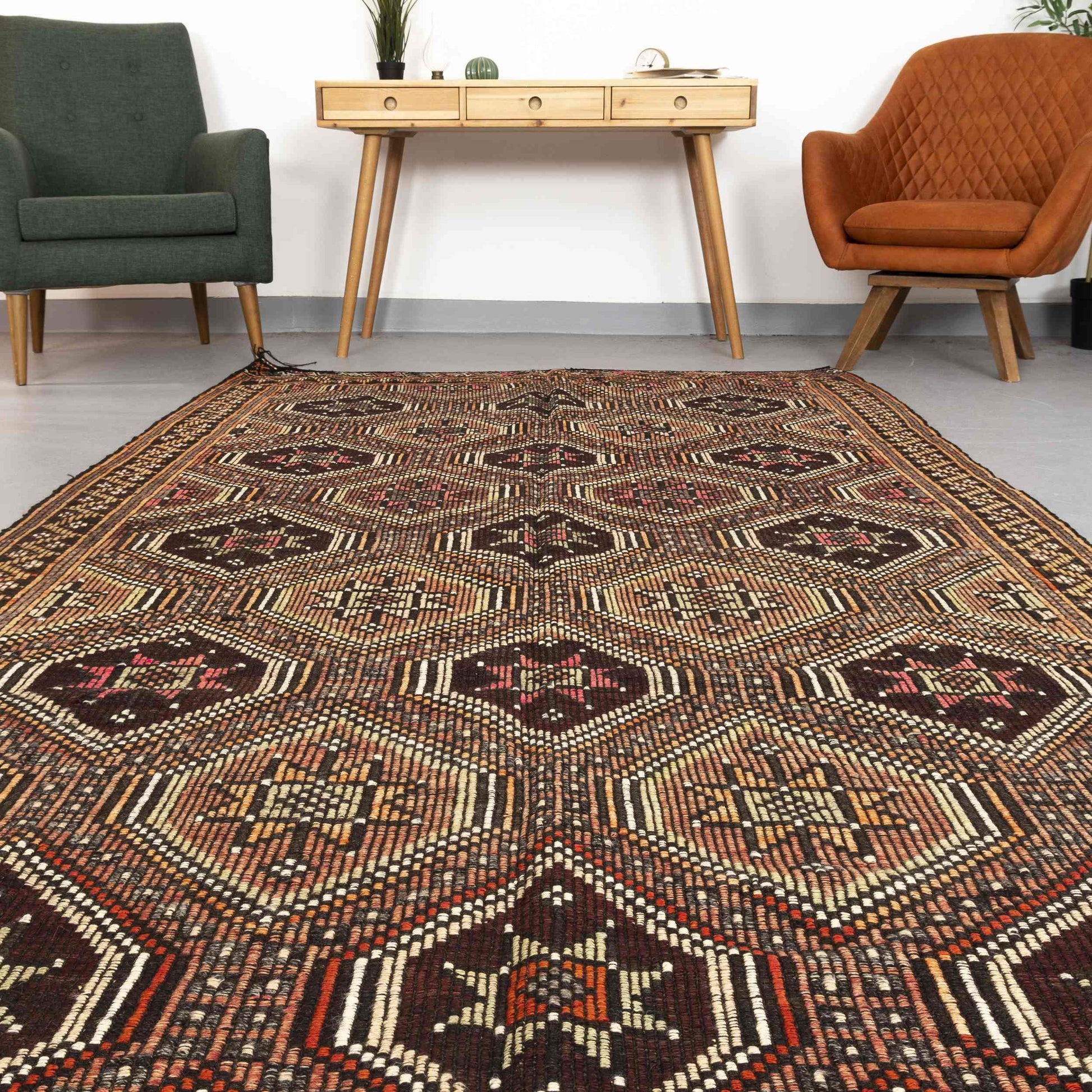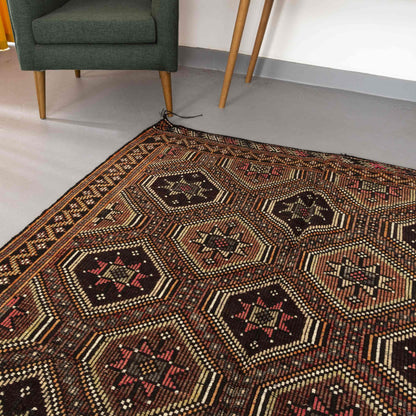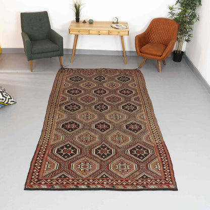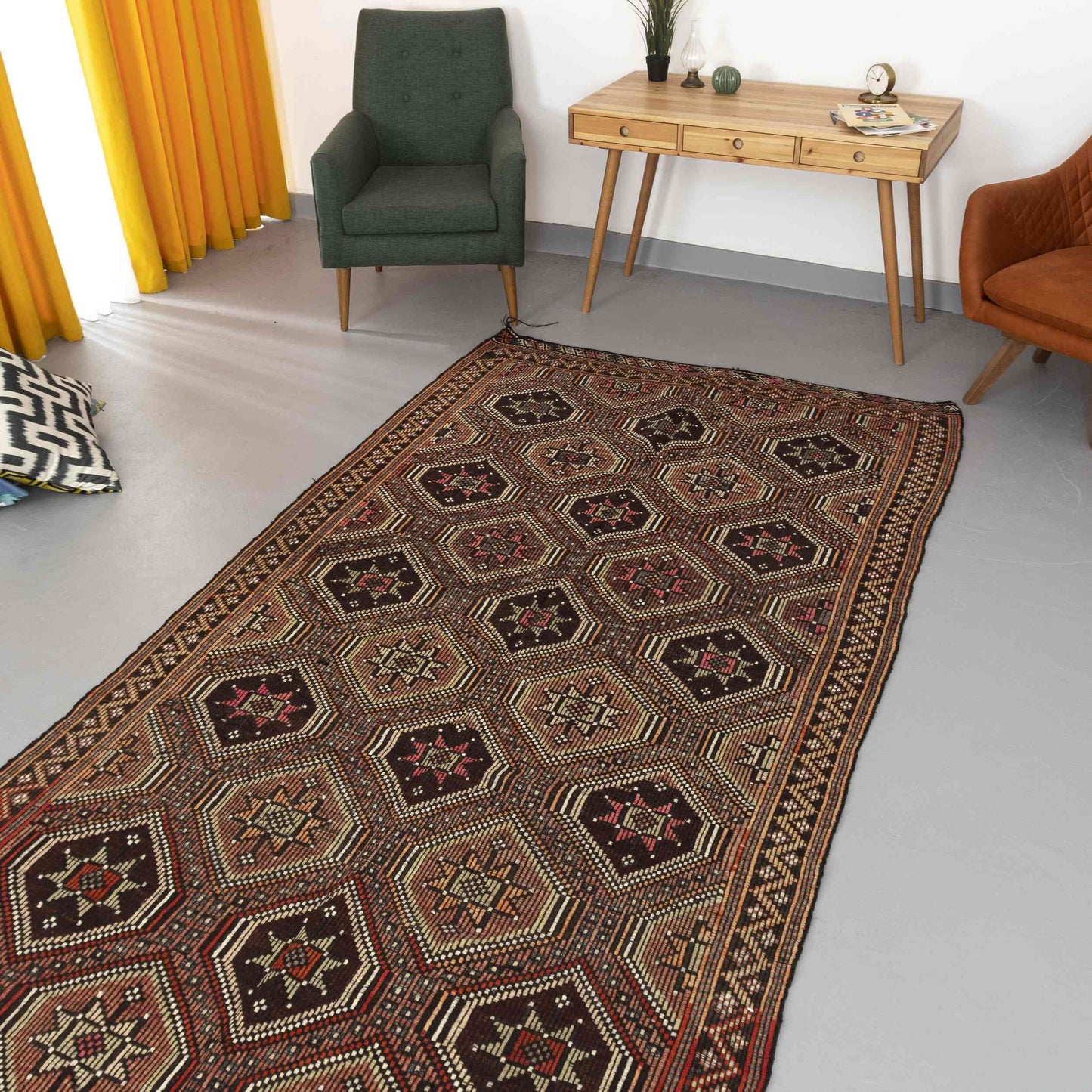 Discover the beauty of Cicim kilims, a true gem in Turkish textile art, featuring handmade wool craftsmanship! This stunning kilim measures 167 x 325 cm (5' 6'' x 10' 8'') and showcases an array of rich brown, black, red, and sand colors intertwined with ethnic geometric patterns.