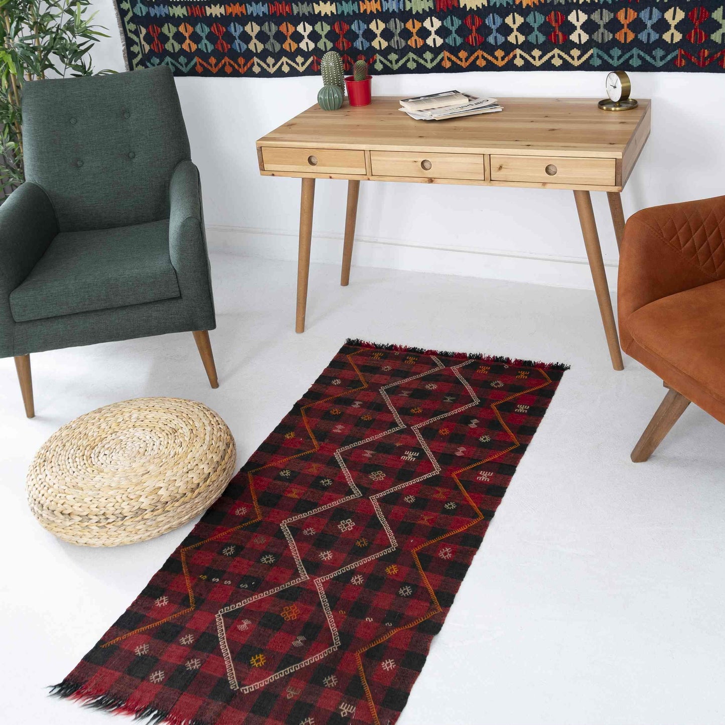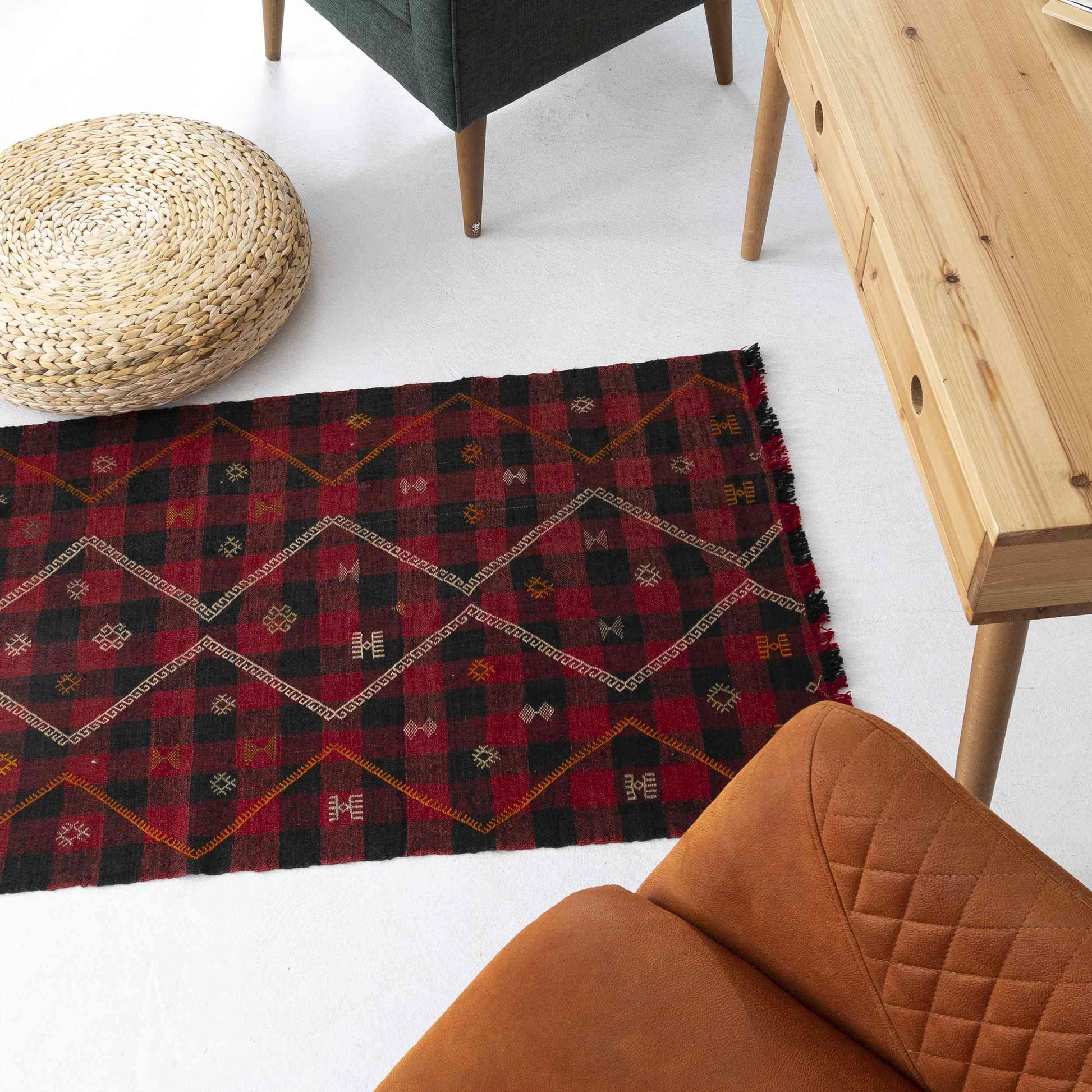 Handmade from luxurious wool on wool, this stunning Cicim kilim measures 76 x 158 cm (2' 6'' x 5' 3'') and showcases a captivating red and black color scheme. Its intricate ethnic geometric patterns reflect the rich traditions of Turkish textile art.
