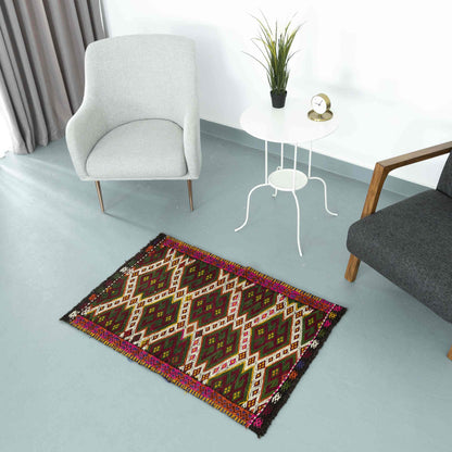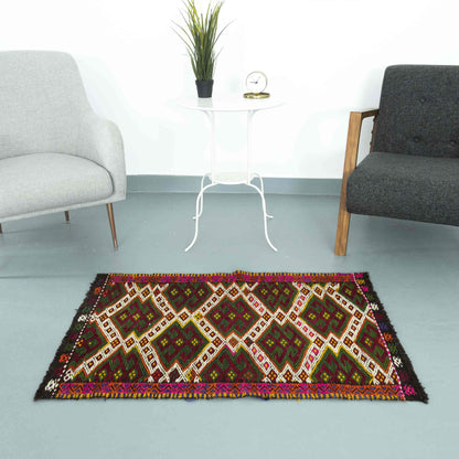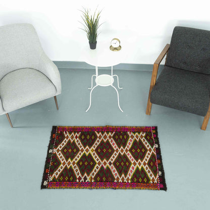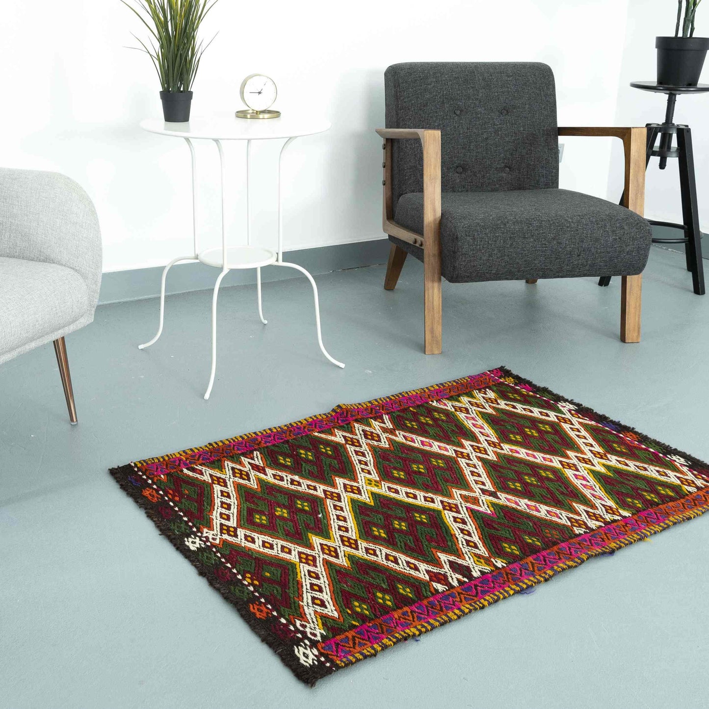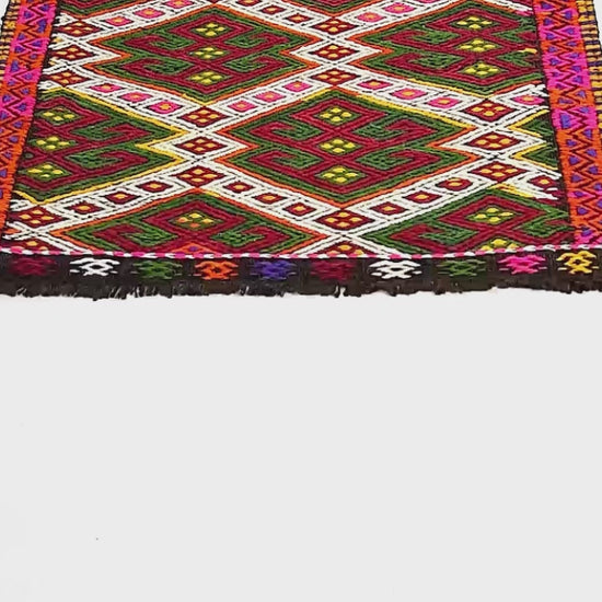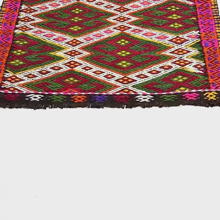 Discover the beauty of our Oriental Kilim Cicim, a stunning handmade kilim crafted from wool on wool. Measuring 78 x 112 cm (or 2' 7'' x 3' 9''), this kilim features vibrant colors like green, pink, white, and yellow along with ethnic geometric patterns that add a unique touch to any space.