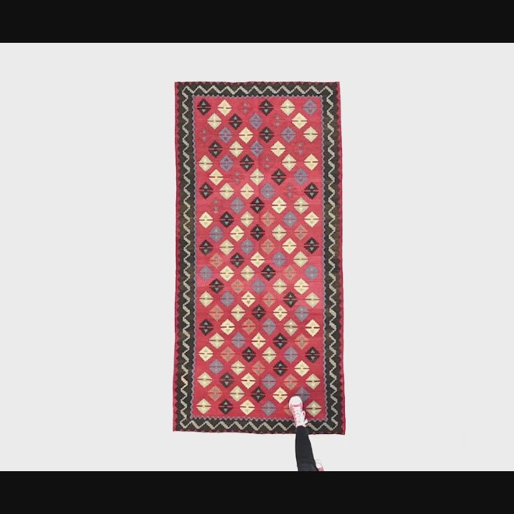 Transform your home with this Authentic Gocmen Kilim, a stunning handmade wool piece measuring 125 x 260 cm (4' 2" x 8' 7"). Featuring intricate geometric patterns and vibrant red and multicolor motifs, this kilim is a celebration of Balkan heritage and craftsmanship.