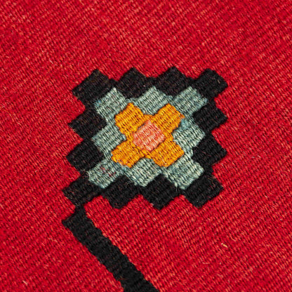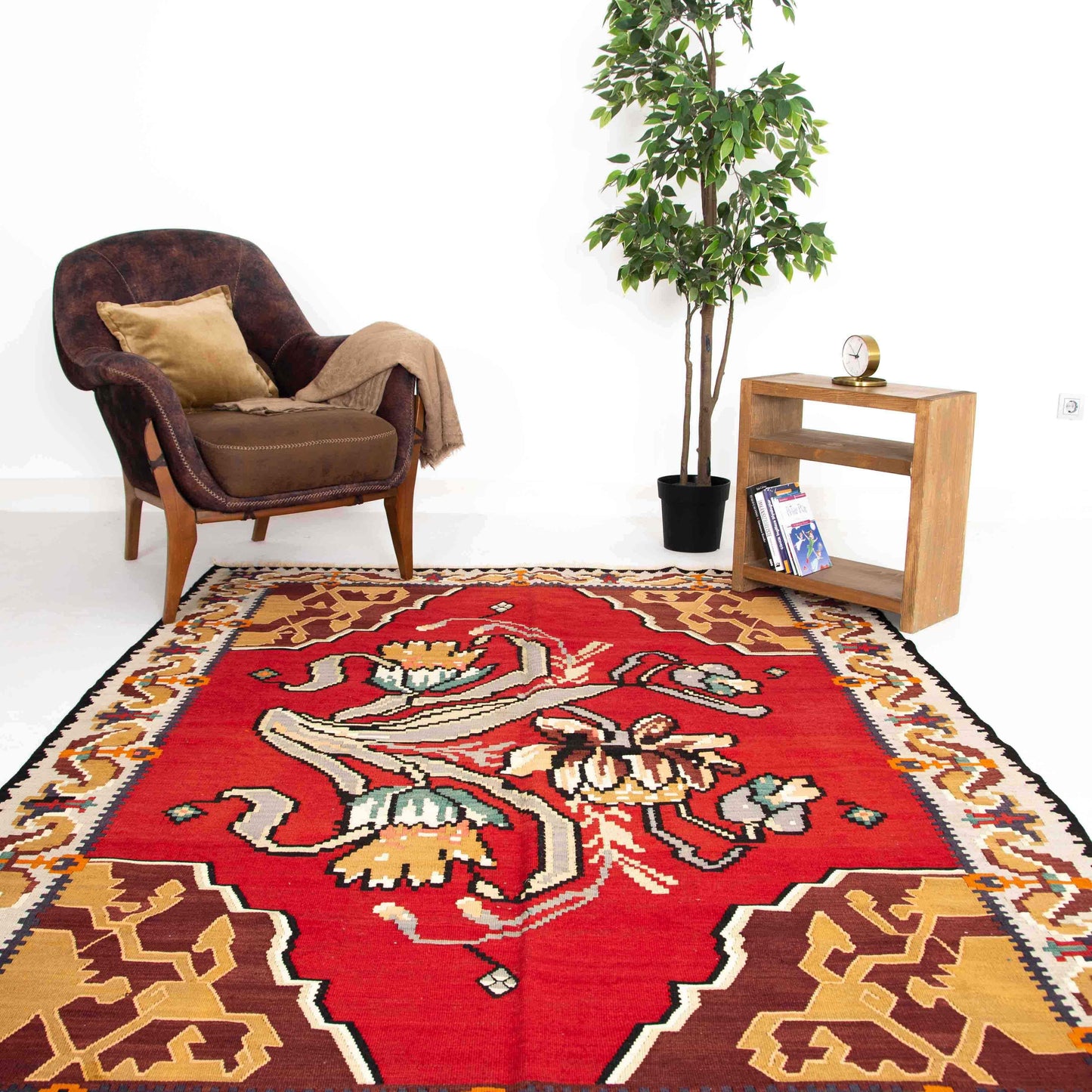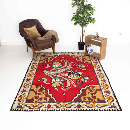 Introducing the Gocmen Kilim, measuring 172 x 238 cm (5' 8" x 7' 10"), this handmade wool-on-wool masterpiece features intricate geometric and floral patterns in rich reds, sands, and blacks. A tribute to the Balkan heritage, it blends traditional craftsmanship, culture, and artistry, offering a unique and vibrant touch to any space.