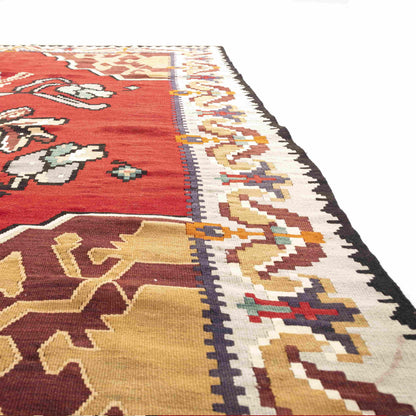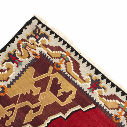 Crafted from natural materials, this Balkan kilim is not only beautiful but also eco-friendly. The traditional dyeing methods used preserve the vibrant colors while minimizing environmental impact, making it a responsible choice for the conscious homeowner.