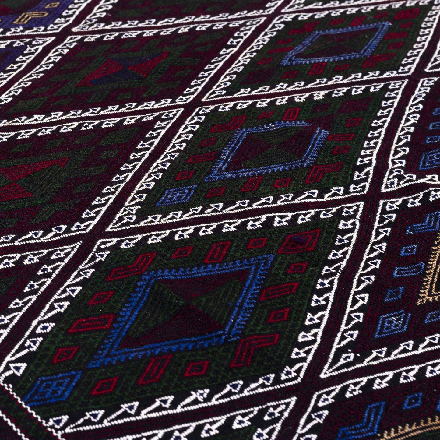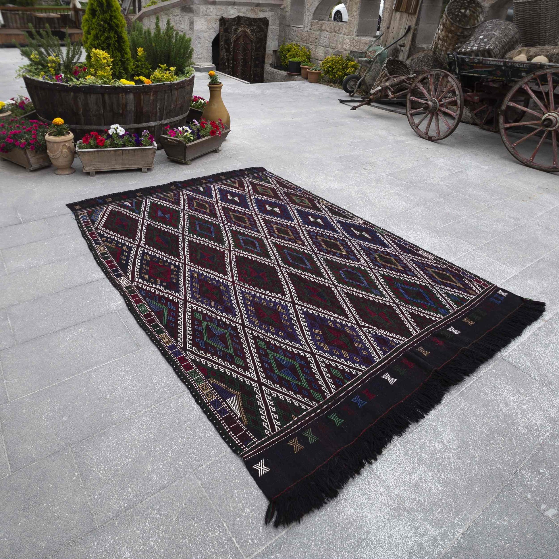 Elevate your space with this Oriental Cicim Kilim, featuring stunning ethnic geometric patterns in a rich color palette of black, burgundy, navy blue, and brown. This exquisite kilim is meticulously handcrafted from **wool on wool, showcasing the intricate stitching details that define its unique character.