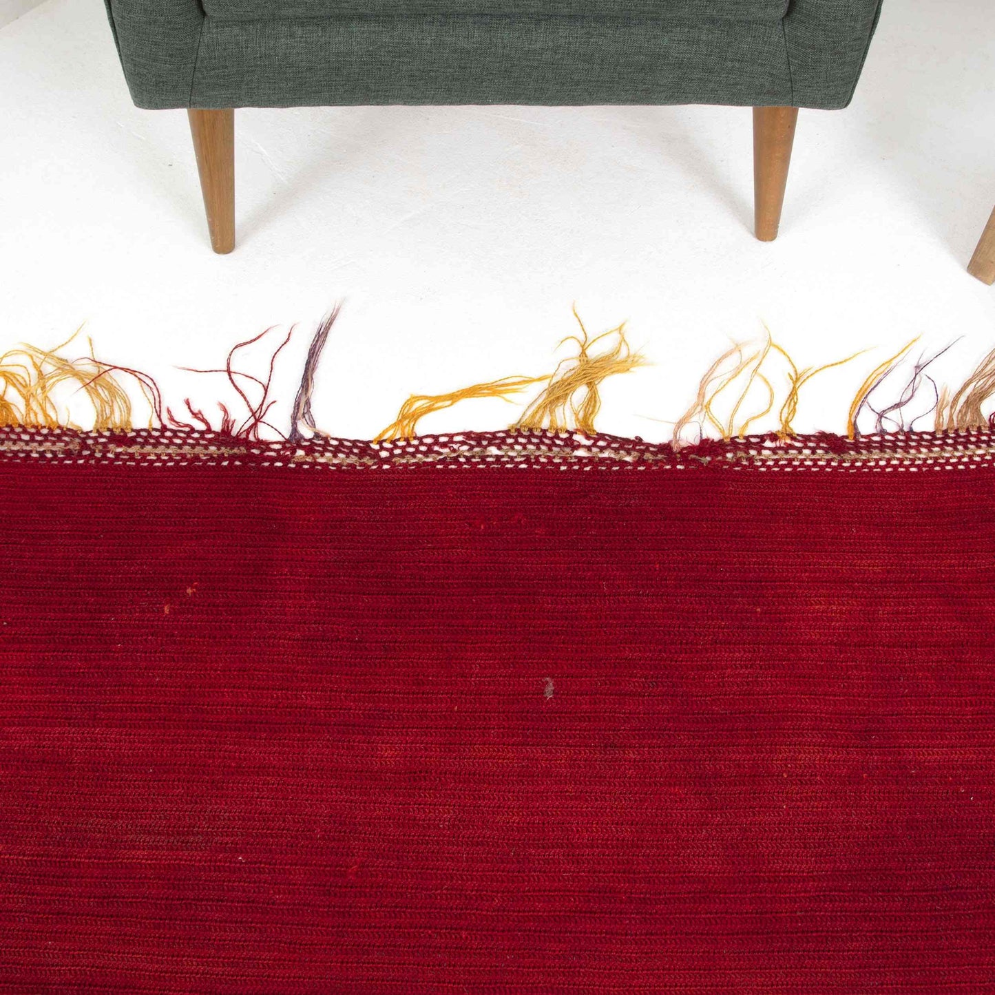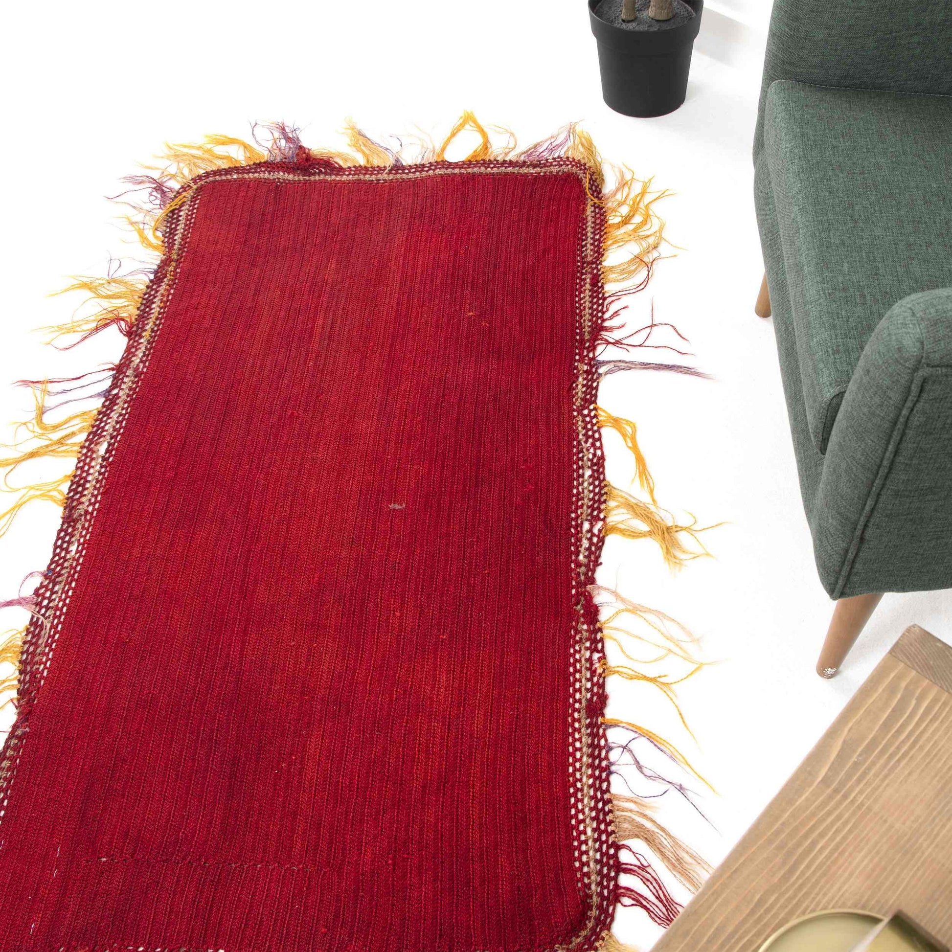 Introducing our Oriental Kilim, measuring 79 x 138 cm (2' 8" x 4' 7"), in a stunning red color. This handmade wool rug showcases intricate patterns that embody the rich craftsmanship of Denizli, utilizing 100% wool, madder dye, and Kirman thread.